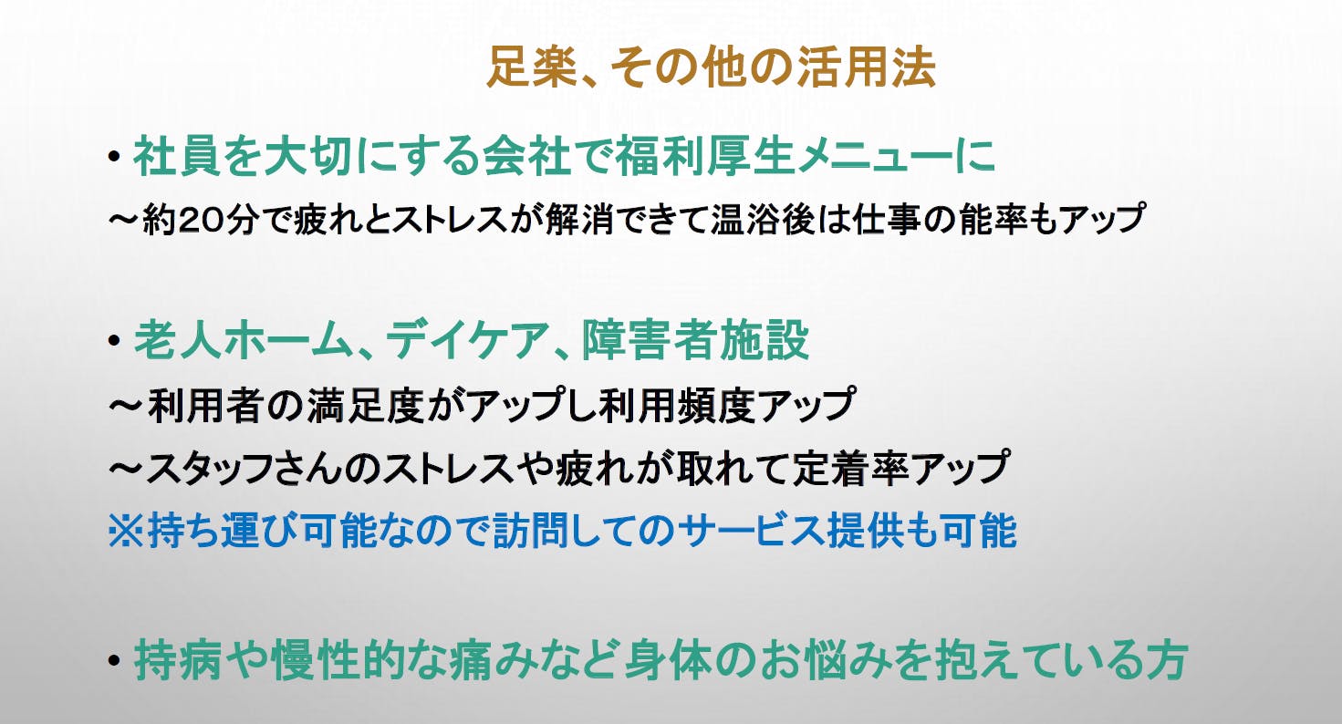 体験してくださったお客様の反応がとてもいいので、たくさんの方々に足楽の事を知ってもらい、地域の方々の健康に役立てたいと思っています。