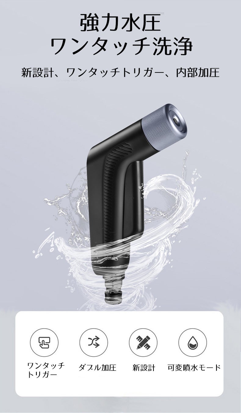 - ①【コンセント不要】ノズル・ホースのダブル自動加圧でパワフル噴射!しつこい汚れを簡単洗浄!