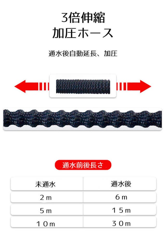 ホースは、3倍伸縮する特殊形状。ホースの高い伸縮性により、水が通ると自動で加圧し、水圧を強くする仕組みです。