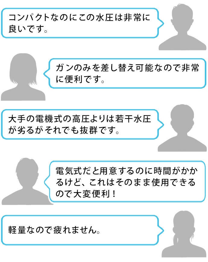 日頃から自動車の洗車や壁に掃除で依存の洗車ガンを使用してますが、あまり水圧が強くなく汚れもそこまで落ちません。。大手の水圧ガンなどを使用しましたが商品自体が大きく移動したり準備したりするのが大変でした。なのでコンパクト設計で強水圧のガンをもっと世の中に広めて洗車をしてる方々の負担を少しでも減らせるようにと思いはじめました。