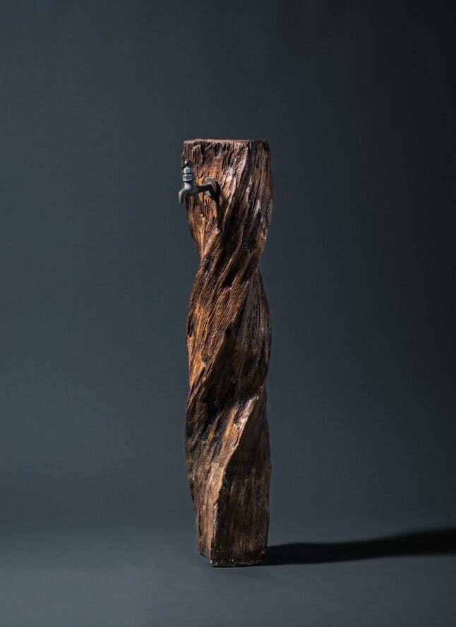 発泡スチロールに似た素材に材料を塗って成形し、その後に塗装することで天然素材を表現したものです。