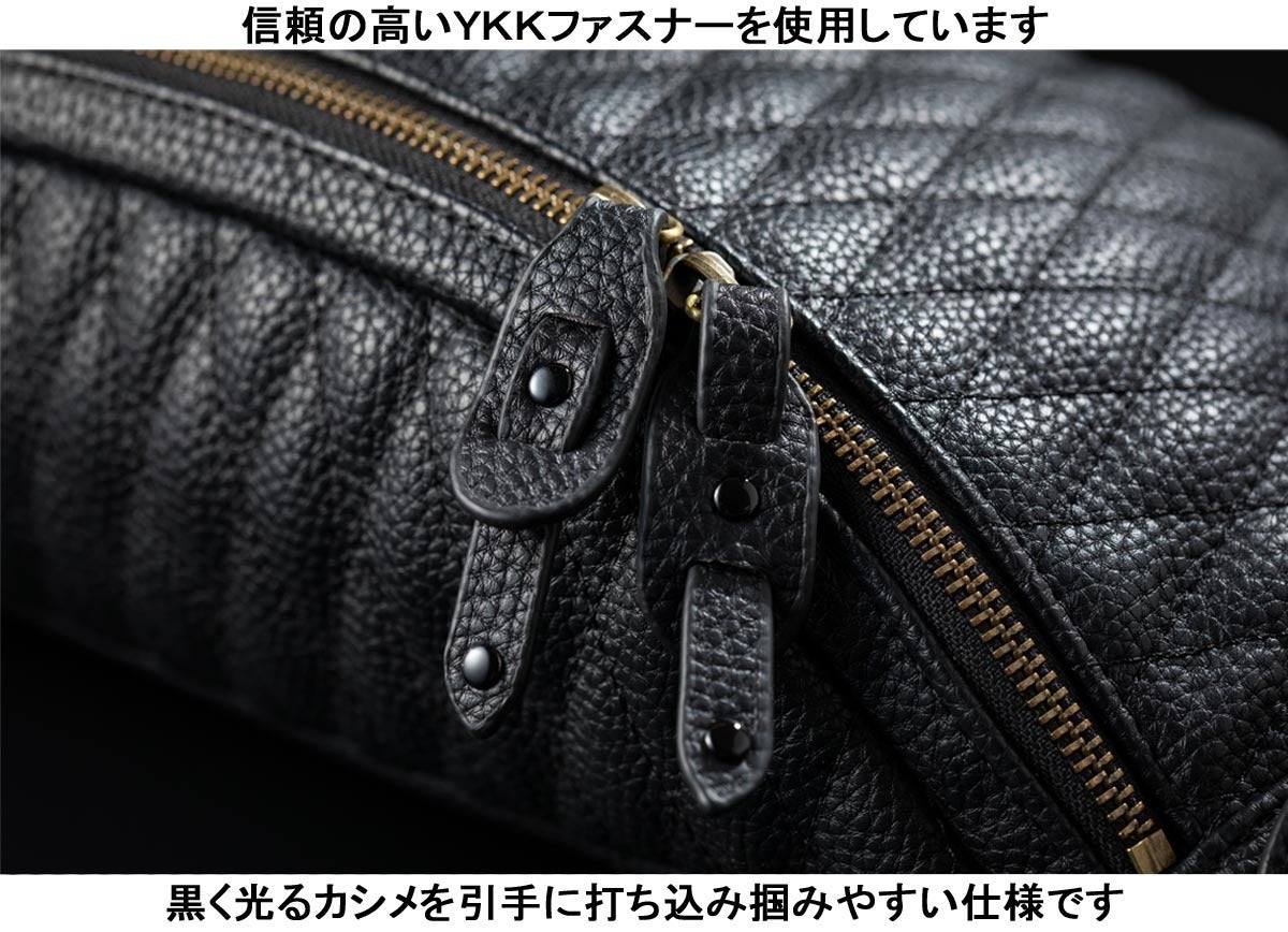 本革と違い、雨や水を弾きますのでツーリングなどに使いやすいバッグです。