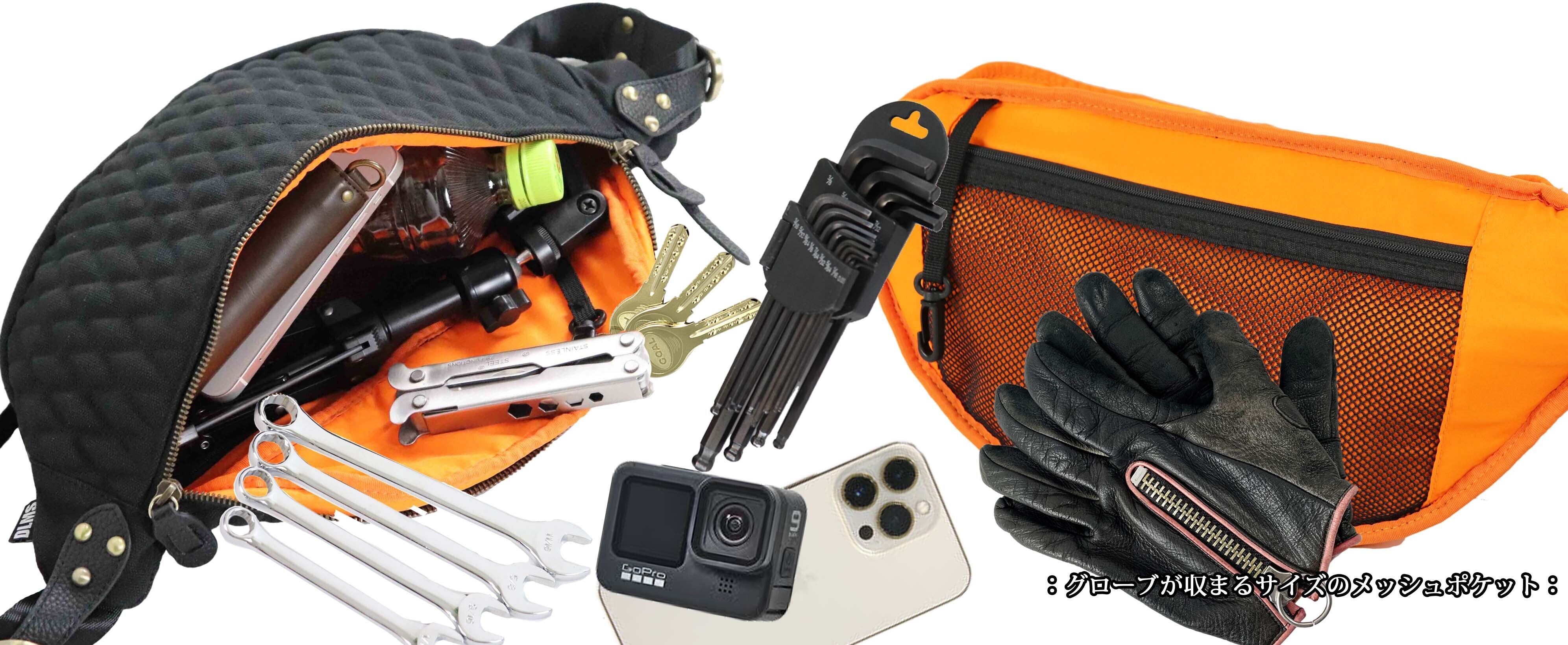 形の崩れないボディ設計や、使用者に考慮したポケットデザインなど機能面を充実したバッグです。沢山の物を入れるバッグではありません。中には500mlペットボトル、財布、スマホ、メガネレンチ、簡単な工具や薄い上着などの着替えを入れて最低限の荷物でツーリングに望めます。