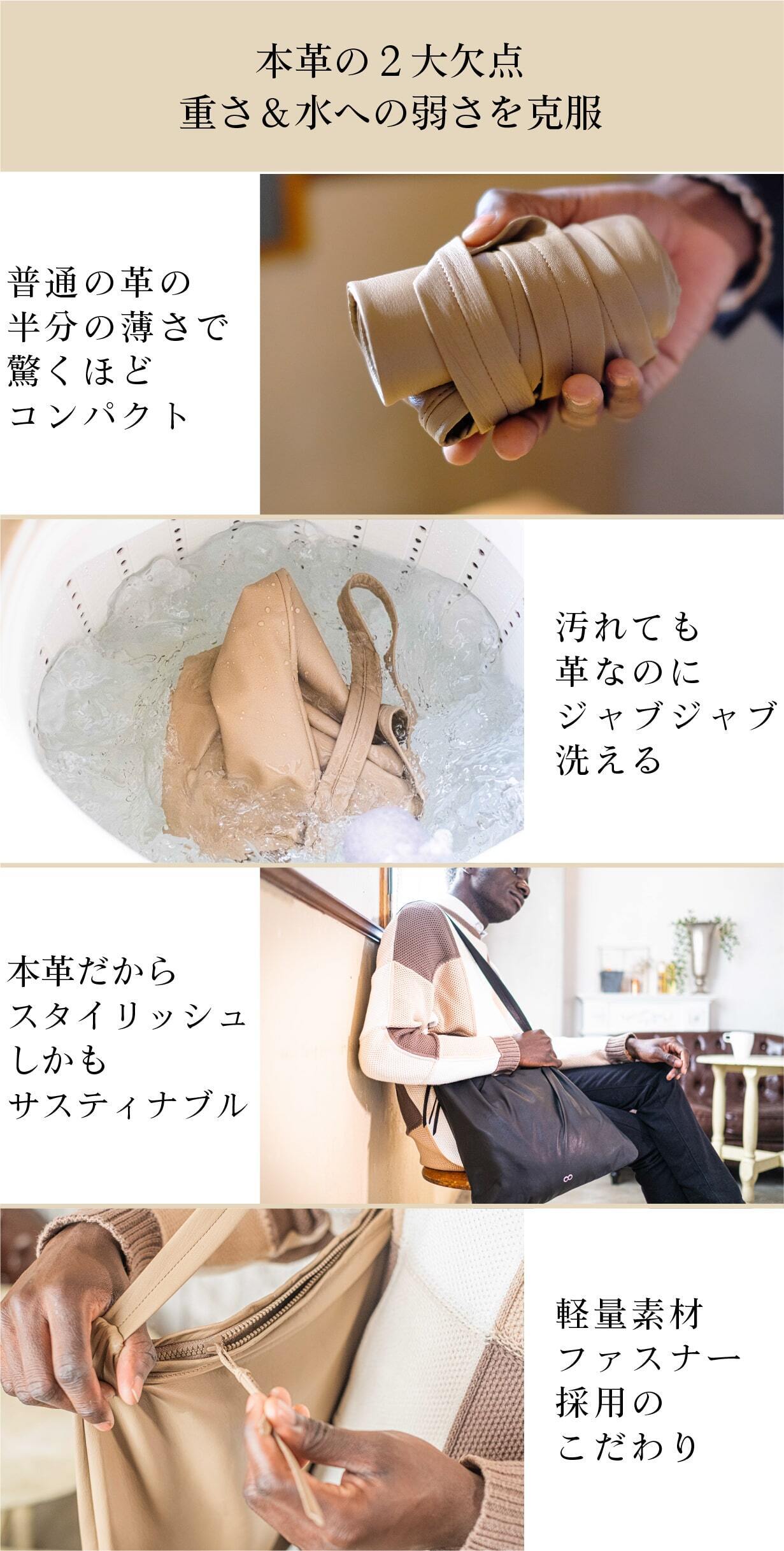 空気のように軽い持ち心地「o2」ブランドを生み出したAmpersand Co., Ltdから生まれた「軽量」&「本革」なのに「洗える」ミニマリストの洗えるレザーマルシェバッグの第2弾【ウォッシャブルレザージップバッグ】をご紹介します。