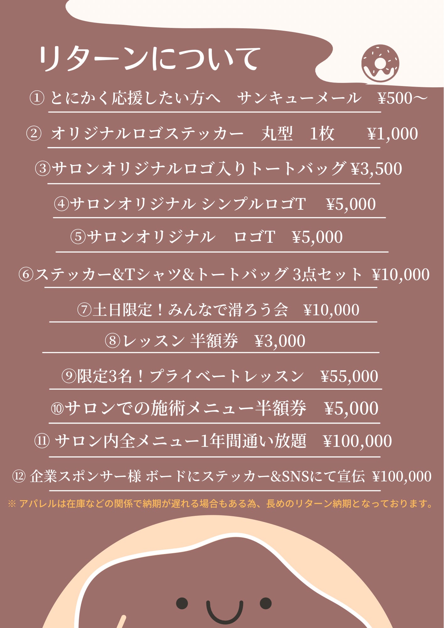 ※全て送料込みの料金になっております。※アパレルに関しましては、在庫状況の関係もありリターン納期を長めに設定させて頂いております。なるべく早くお届け出来る様に手配致しますが前後する場合もございますのでご了承下さい。