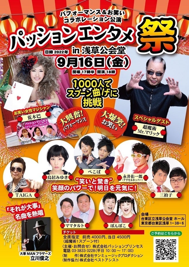 2022年9月16日(金曜)に浅草公会堂にて、お笑い×パフォーマンスのコラボレーション公演「パッションエンタメ祭 in 浅草公会堂」を開催いたします。
