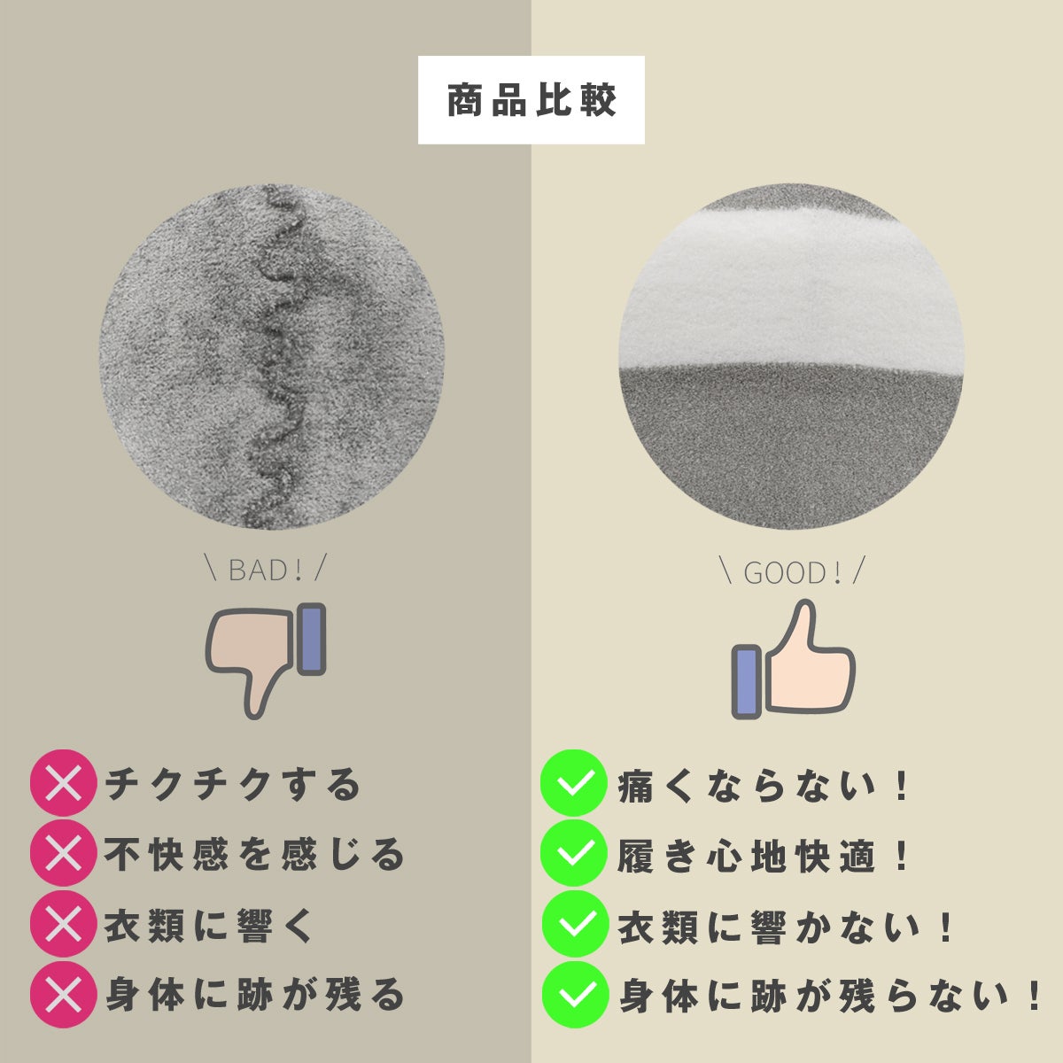 縫い目がないことによるメリットは、ストレスフリーな着用感、縫い目が肌と擦れないから低刺激、他の着用商品に響きにくい、などが挙げられます。