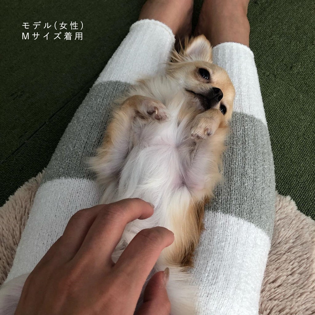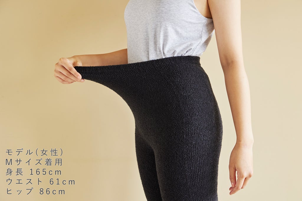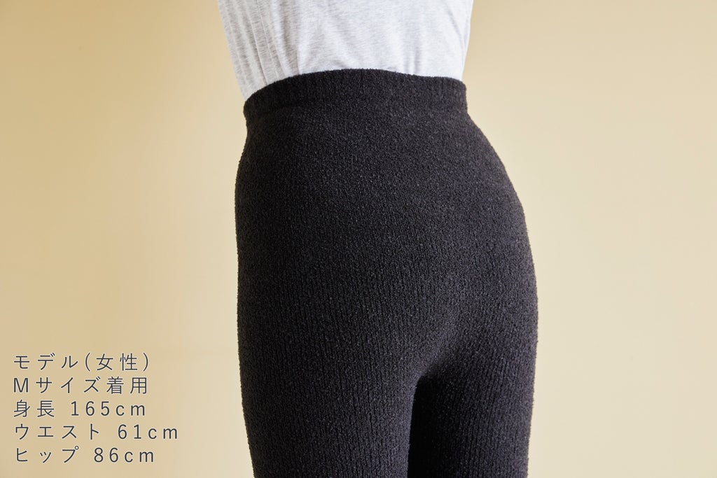 本商品は弊社のニット製品と同様の糸で編み立てています。その糸は「シュークリーム糸」と言い、柔らかくて温かいという特徴があります。シュークリーム糸は染色の段階で体を温める効果が期待できる、”カプサイシン(唐辛子成分)”と”カモミール成分”が配合されています。そのため足首から胸下まで自然由来の温かさで下半身全体を優しく包みます。