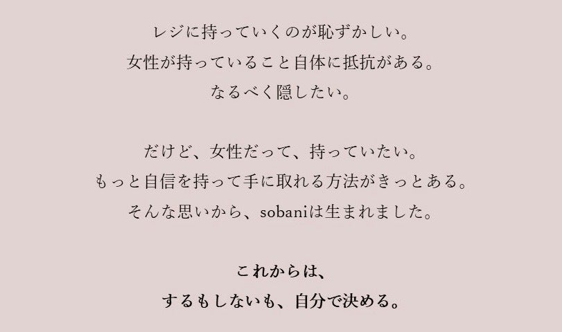 コンドーム に関し、フランクに会話できるカルチャーをつくっていきたいと言えど、突然「コンドーム 」と書かれた宅配便が届くのに抵抗を感じる方も多いと思います。sobaniのリターン発送時に品名を記載する際には「化粧品」と記載いたしますので、ご安心ください。sobaniはこれからも、皆様のそばに寄り添う存在でありたいと思っています。