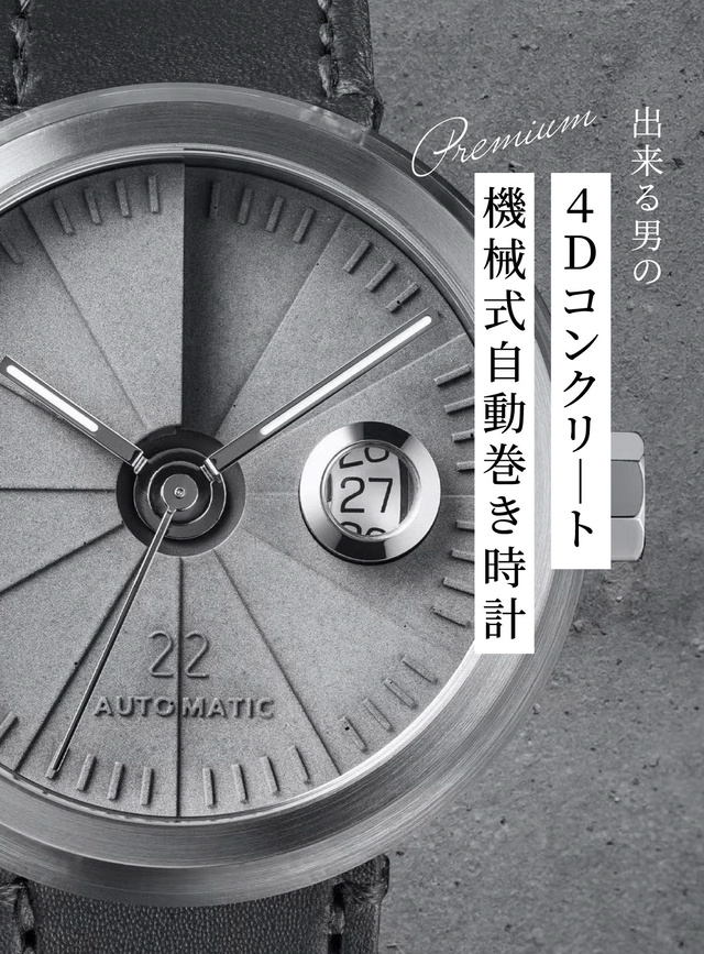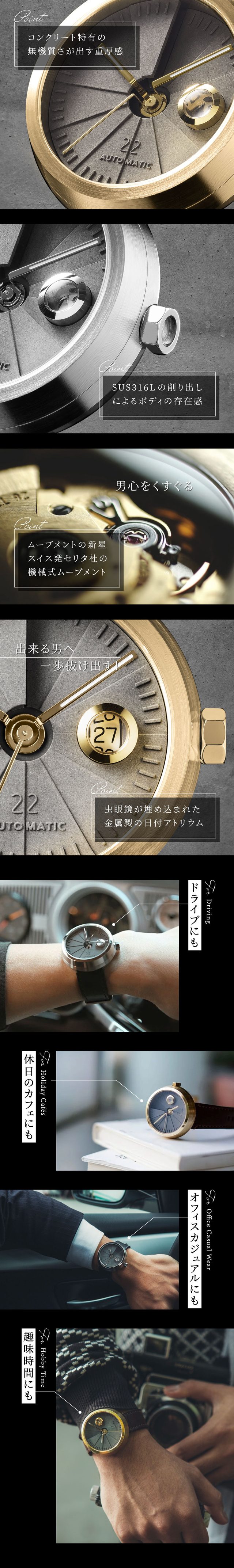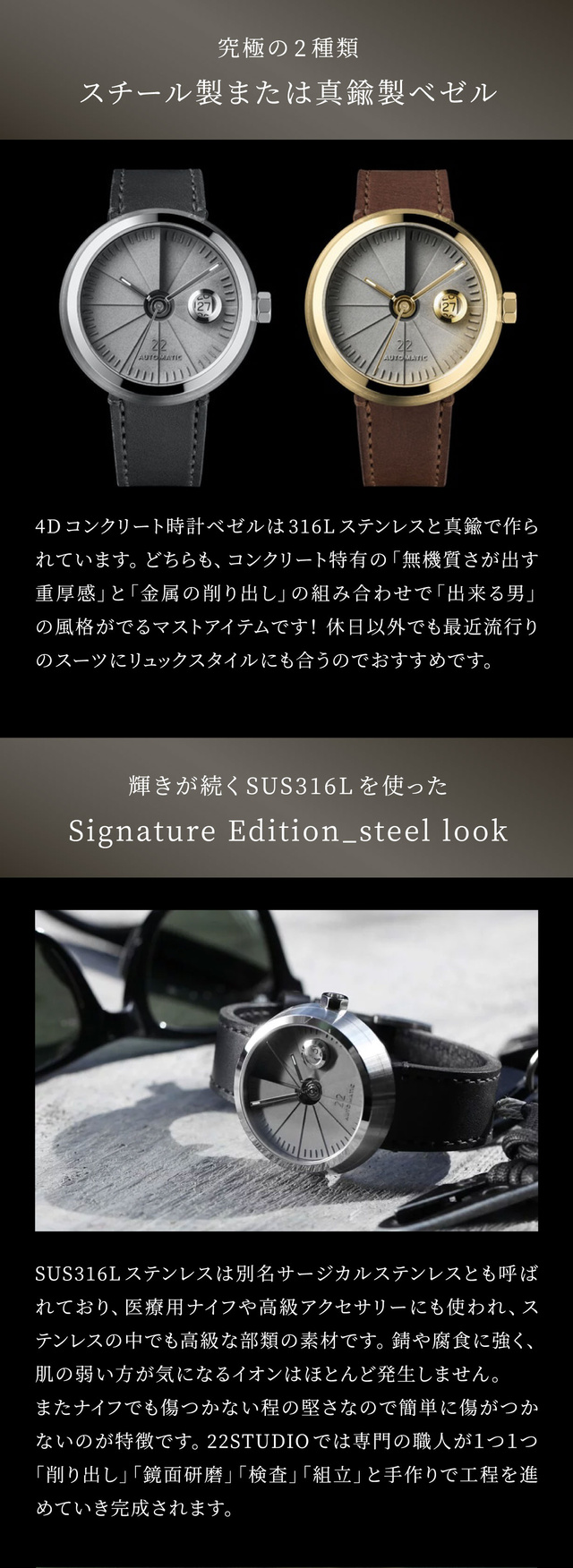 ミクロン単位の加工が求められることも珍しくなく、そこで培われた精密な機械加工技術を活かして出来た時計が22STUDIOの時計です。さらに時計には珍しいコンクリートの文字盤を採用しており他にはない出来る男の時計に仕上がっています。