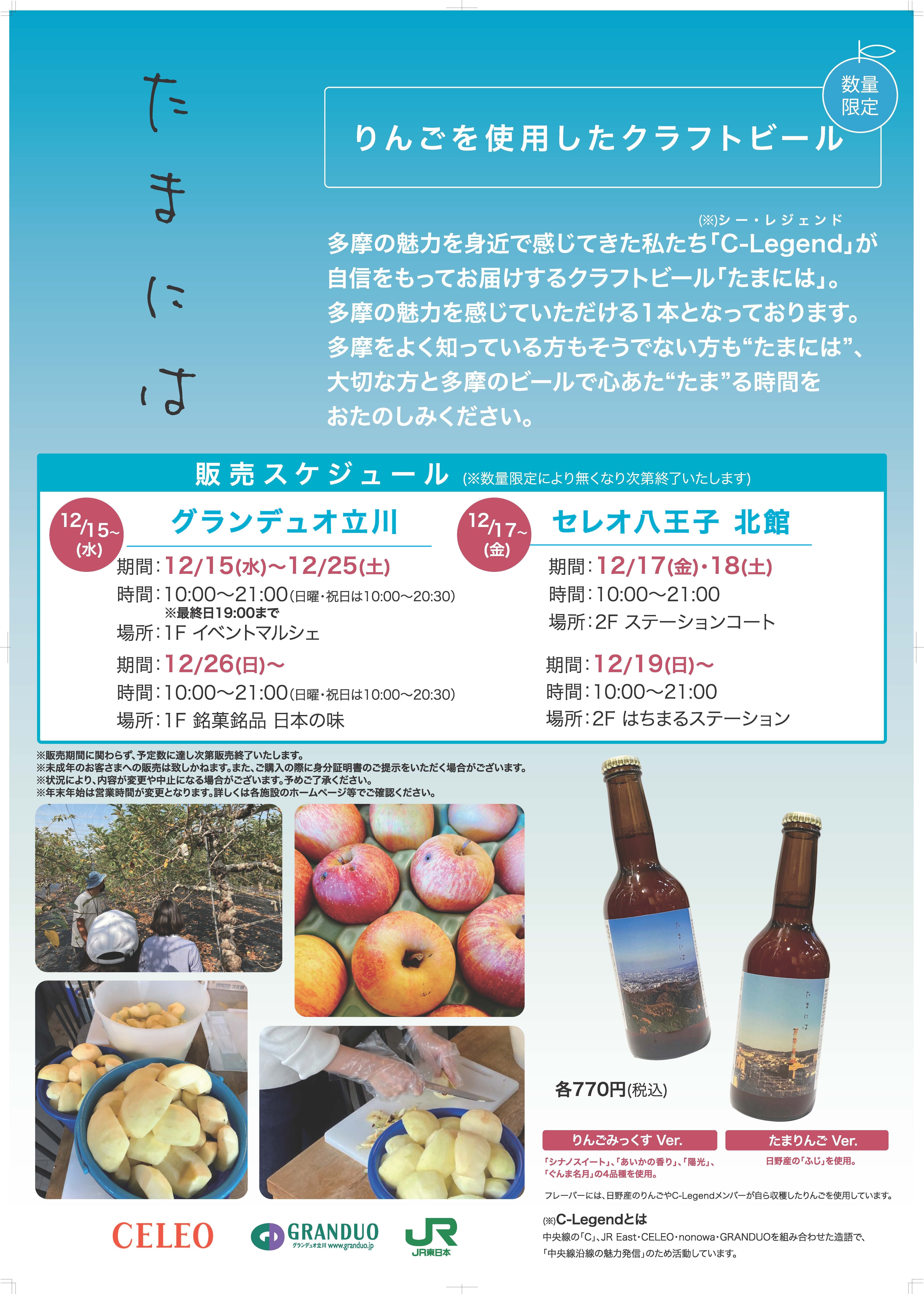 JR 東日本グループの株式会社 JR 中央線コミュニティデザイン(CELEO/nonowa)とジェイアール東日本商業開発株式会社(GRANDUO)は、JR東日本八王子支社協力のもと、地域の魅力向上と新しい事業の創出をめざしたプロジェクト「C-Legend(シーレジェンド)」(※1)の取組の一環として、オリジナルクラフトビール「たまのごほうびーる」を発売します。