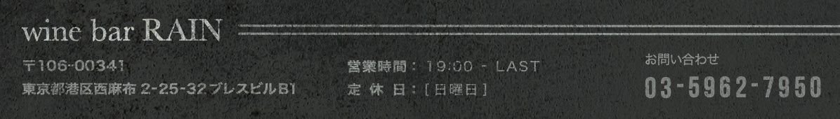 当店は西麻布にありますワインが大好きなソムリエによる、ワイン好きのためのワインバーRAINです。お陰様で4月に4周年を迎えました。数多くの業界の著名人、経営者の方々にワインを楽しんでいただいています。