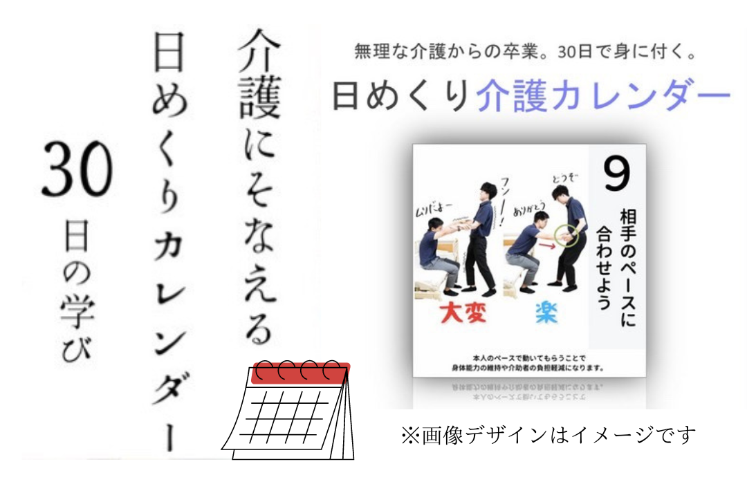 カレンダーを一日・一枚めくるだけ。ペラっとカレンダーをめくるだけで、専門家しか知らない介護のコツを学ぶことができるカレンダーです。