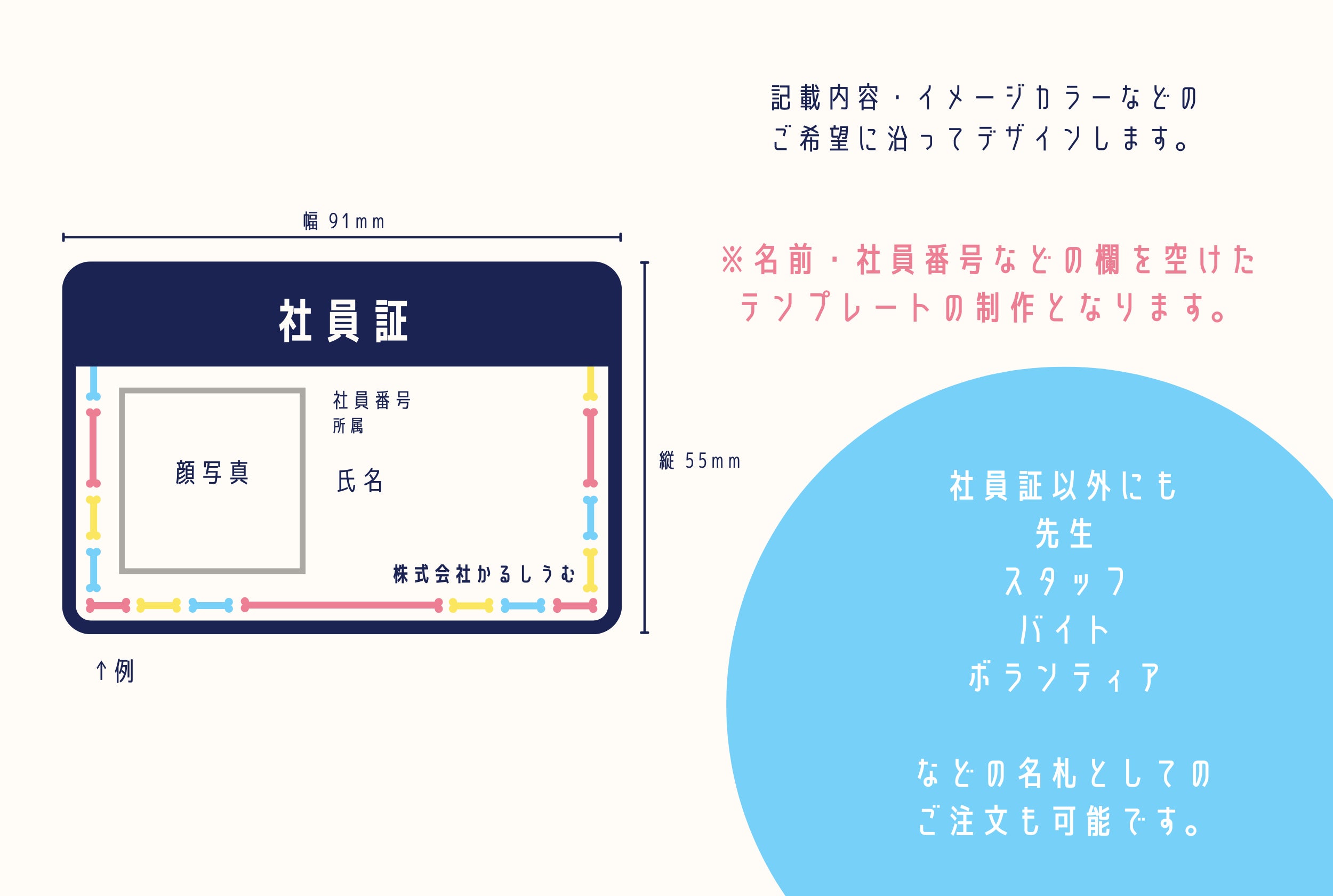 社員証のテンプレートデザインを制作します。(氏名の欄・社員番号の欄などを空白にした状態)