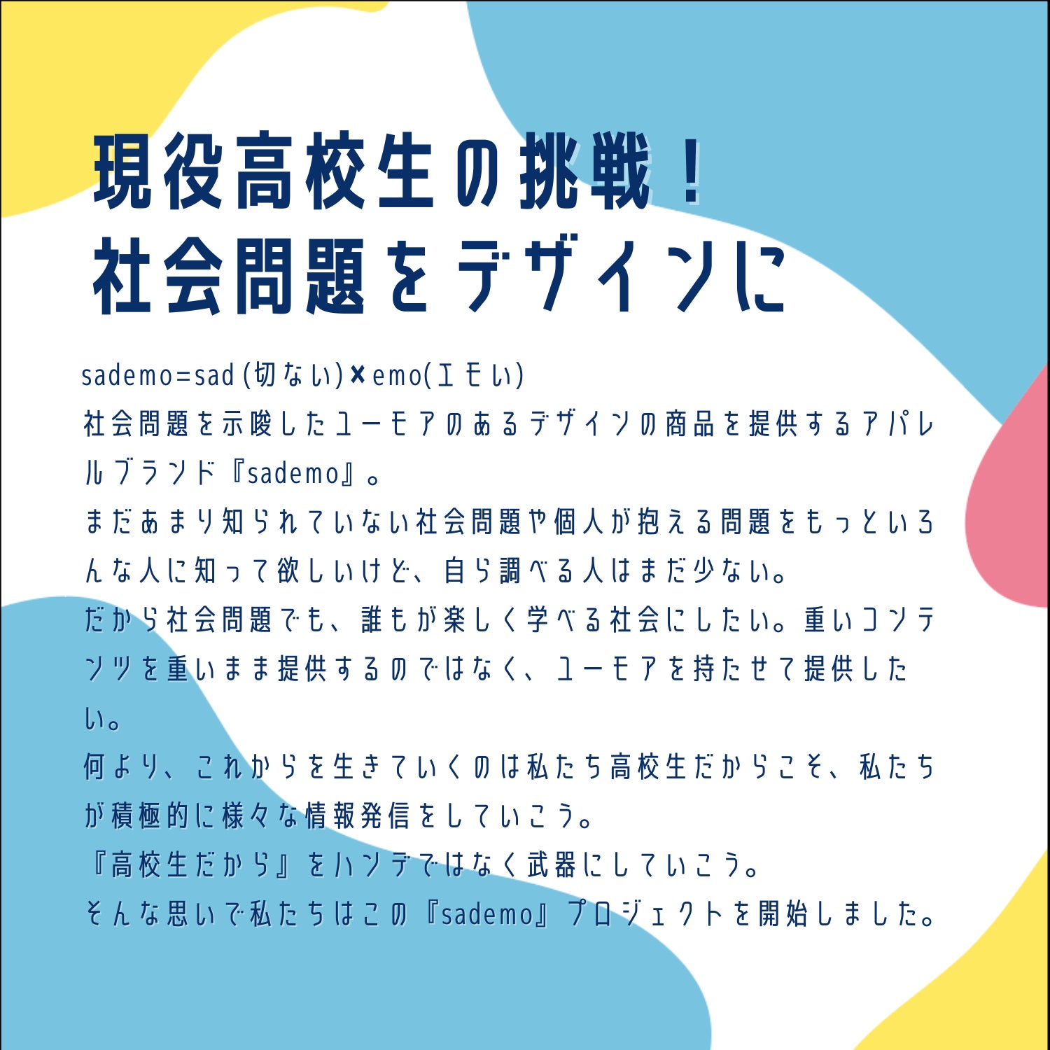 それを実現させるため、私たちはこのクラウドファンディングを成功させ、sademoというこのアパレルブランドを立ち上げたいのです!