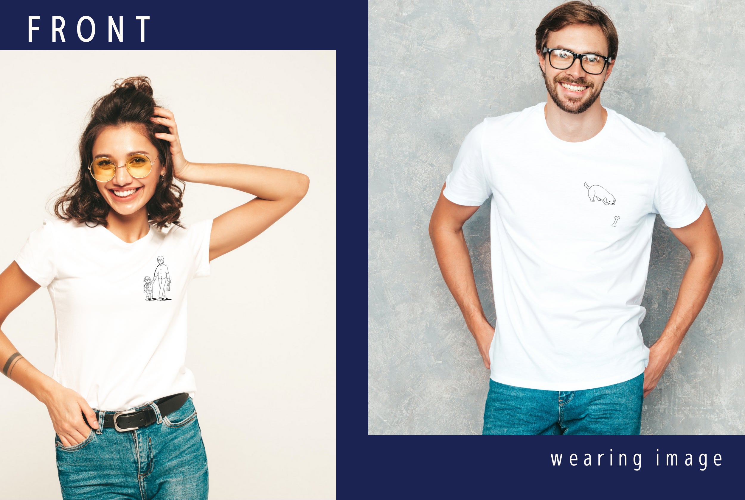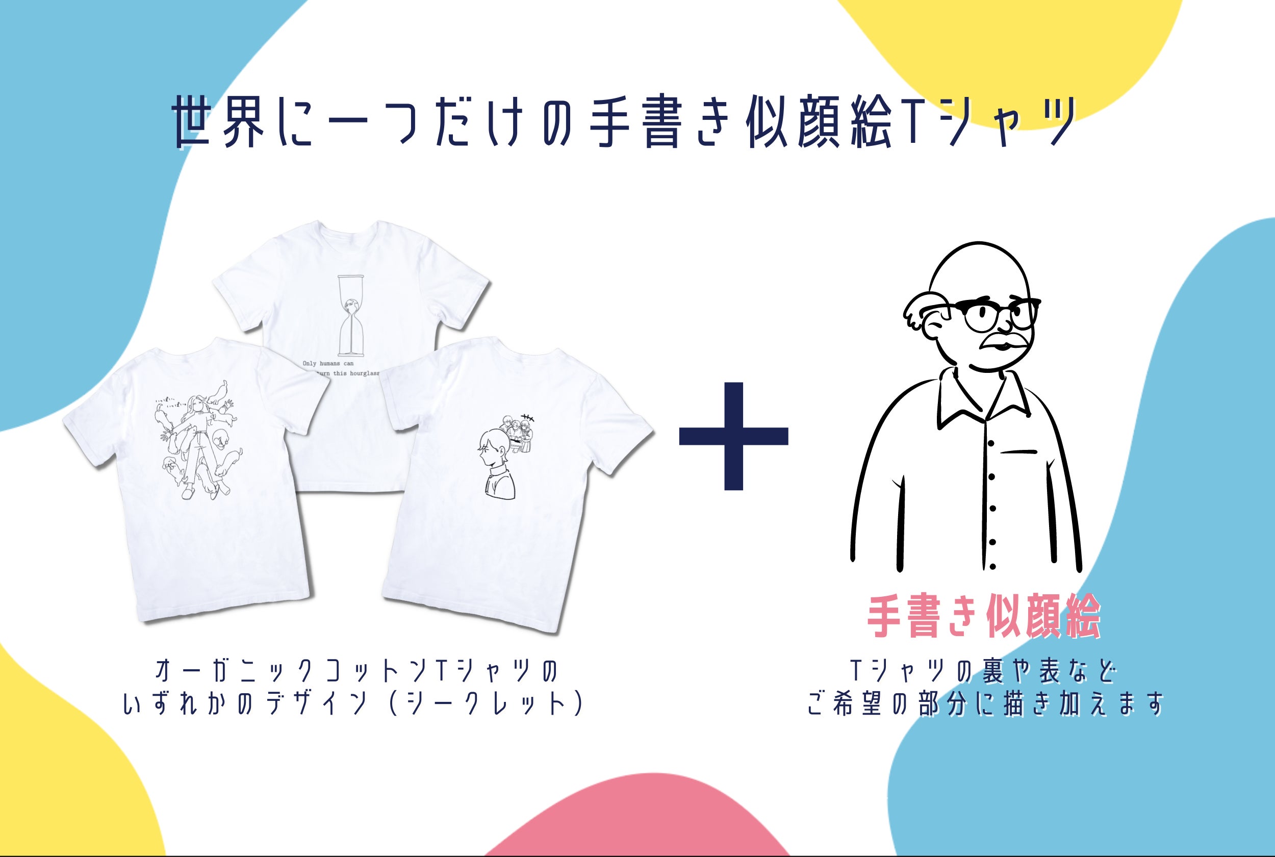 ③のオーガニックコットンTシャツの3種類のうちどれかのTシャツにご希望の似顔絵を手書きで描いてお届けします。(Tシャツのデザインは選べません)