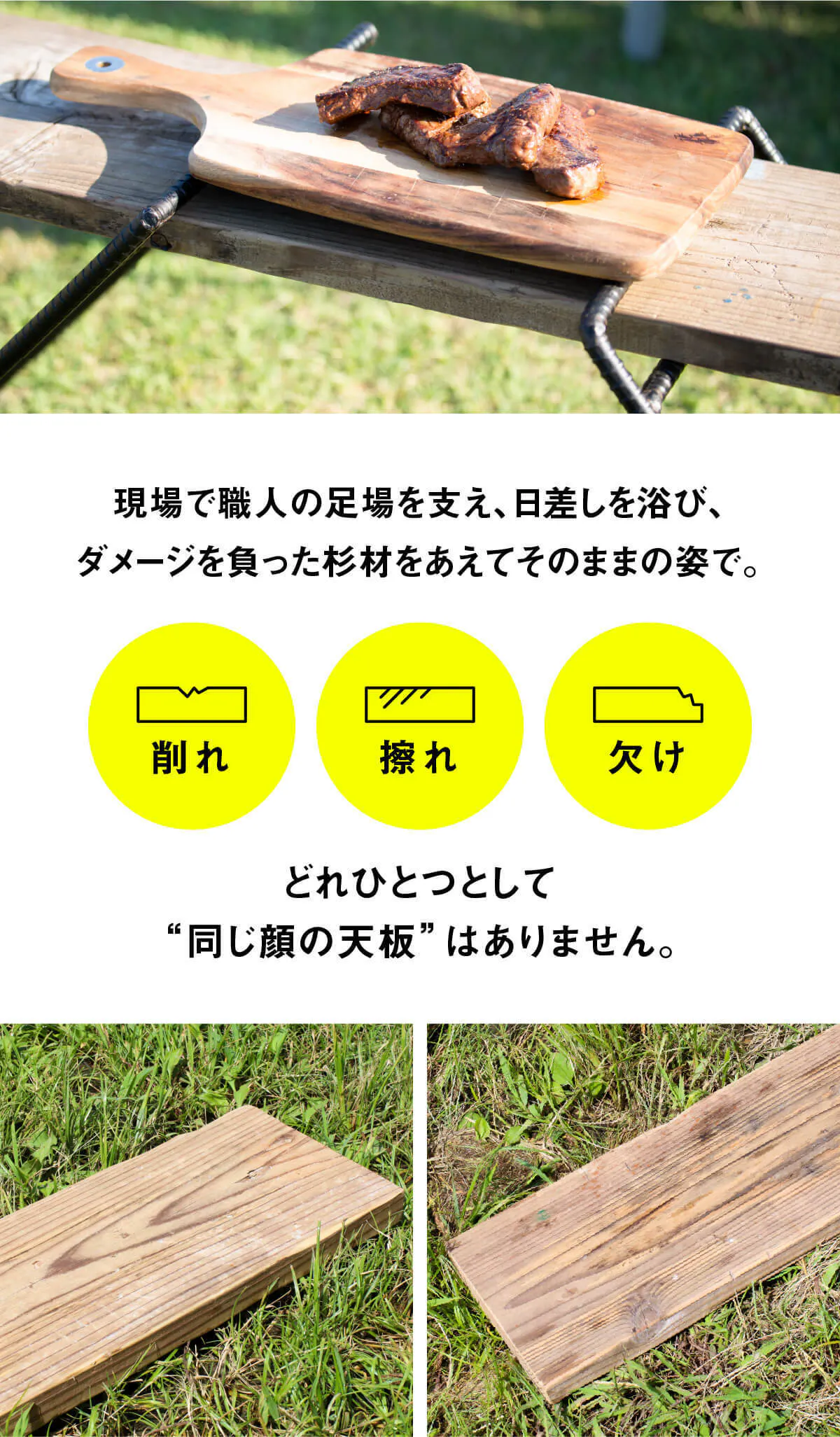 足場板は、使われてきた状況も期間もそれぞれ異なるので、個体差があります。