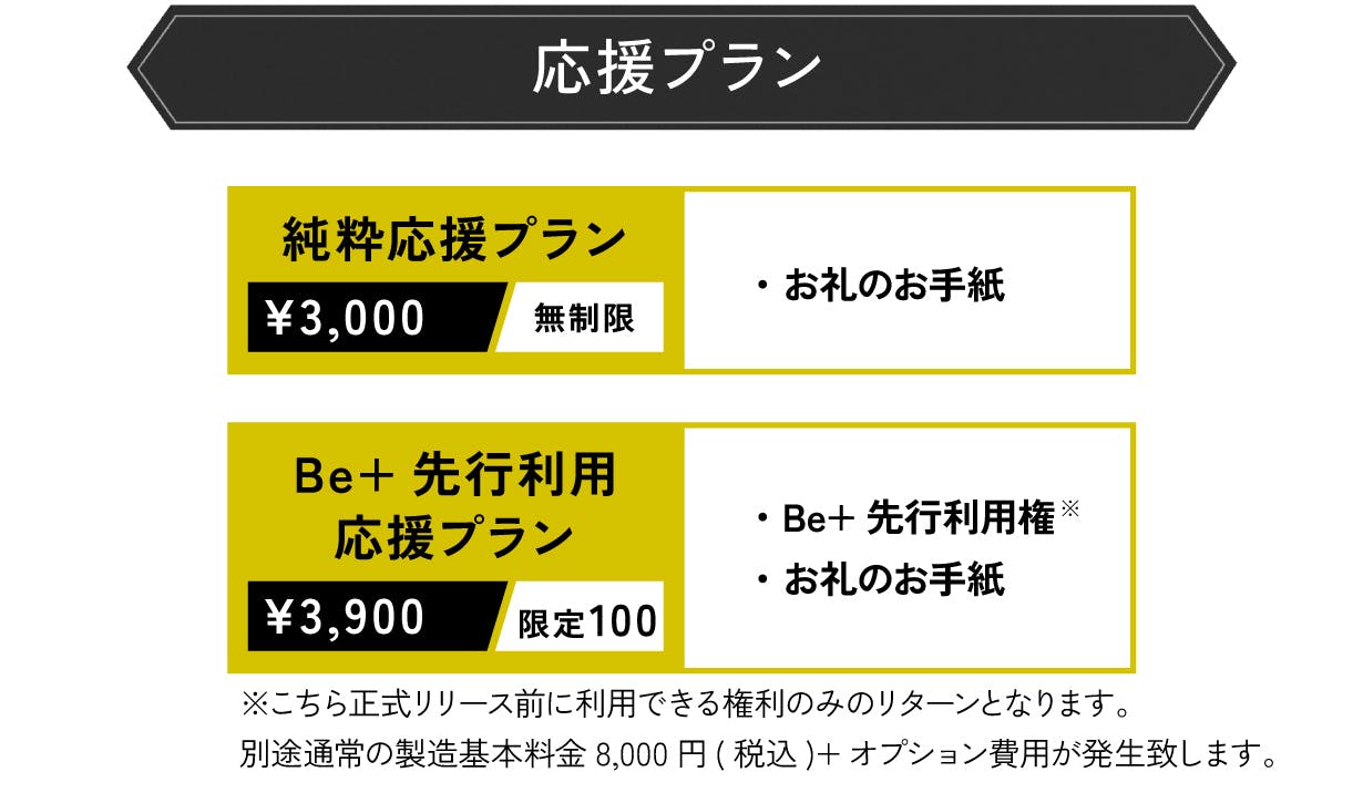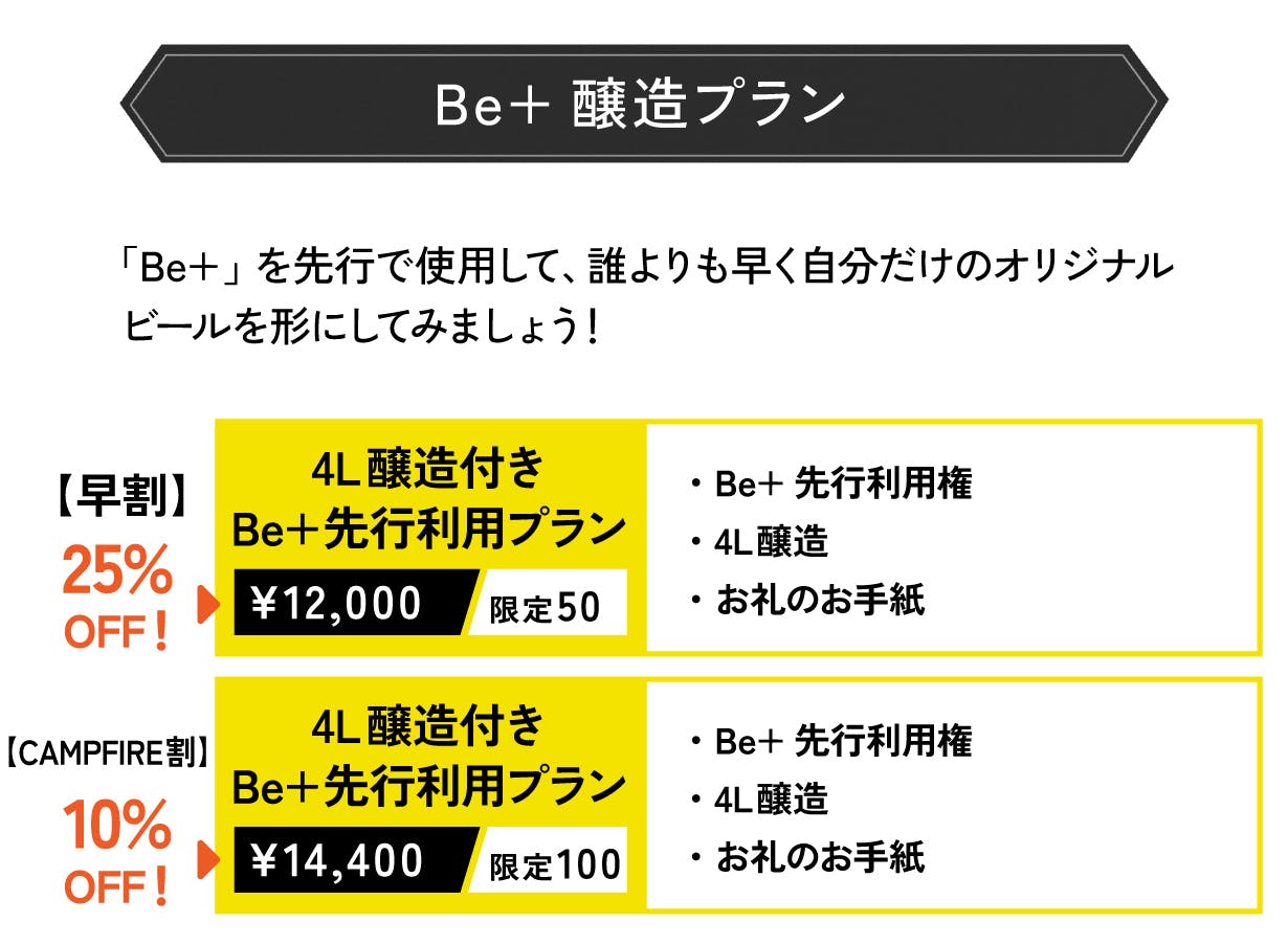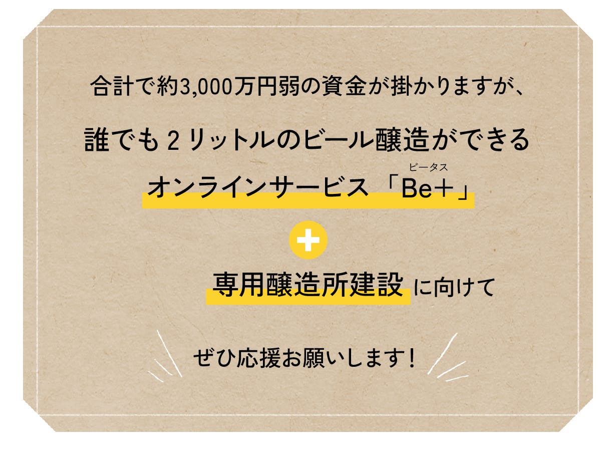 今回オリジナルビールが作れるオンラインサービス「Be+」のリリース及び専用醸造所を作るため、ぜひ皆様にお力添え頂ければと思います。