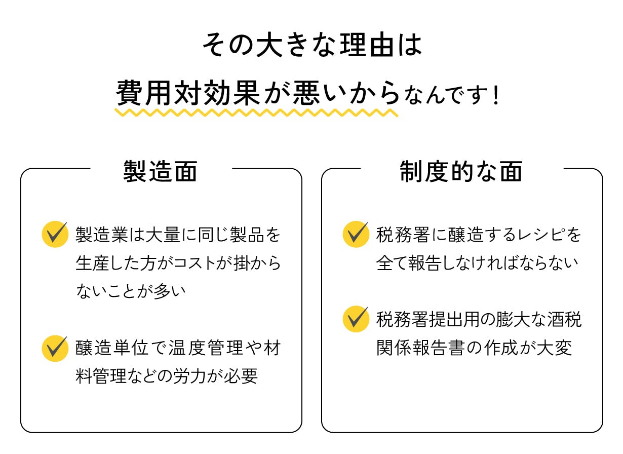ただでさえ1種類のビールを作るのにコストや手間や税務署対応が必要なのに、1度に何種類ものビール醸造をするのはとても煩雑です。費用対効果を考えて、多くのビールメーカーはある程度の種類に絞った醸造を行っています。