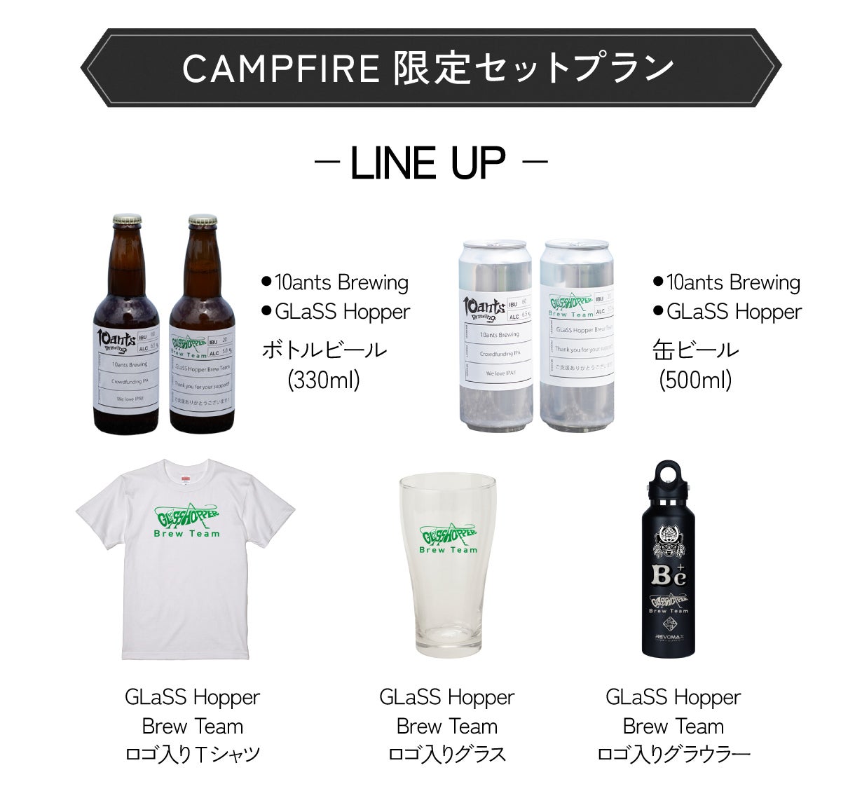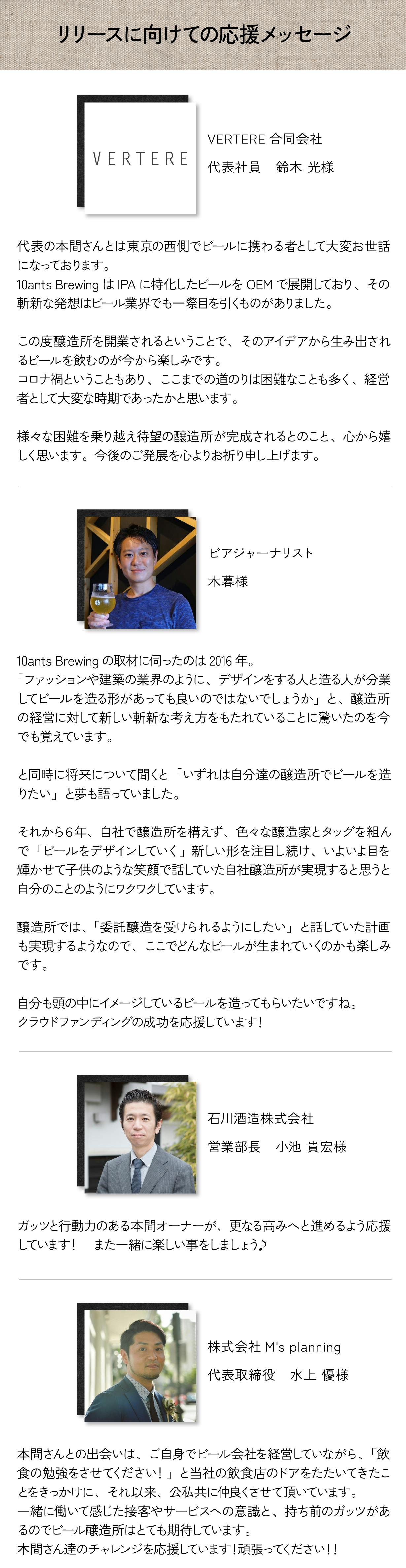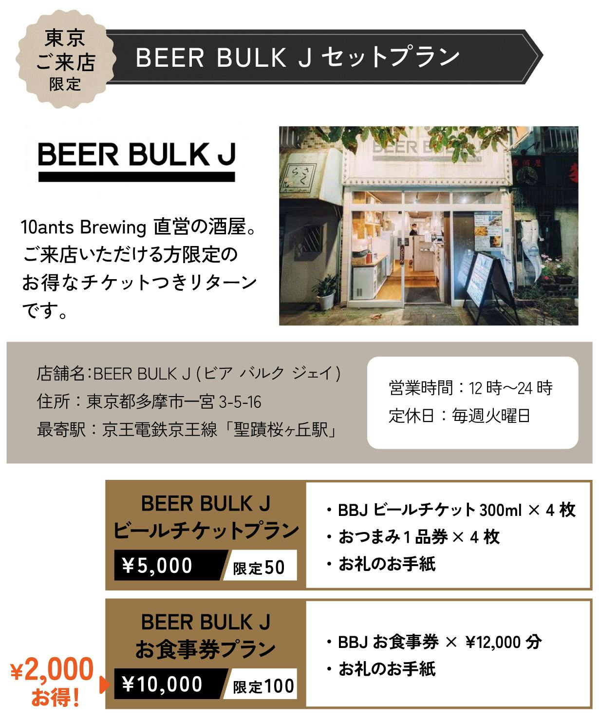 醸造所建設にあたって「10ants Brewing」、「直営店BEER BULK J」についてよくご理解のうえ応援して頂きたいという想いから、実際に東京にご来店頂ける方から、東京までは来られない方にも全員にお楽しみ頂けるリターンを多数ご用意しました。