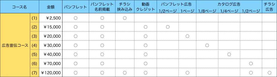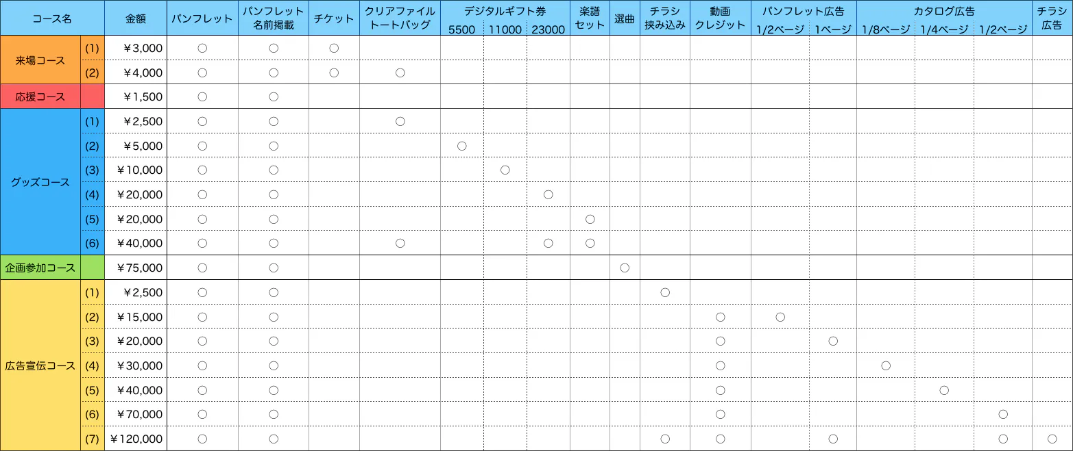 主に、事業者・団体向けのリターンコースです。人が注目し、人が集まる機会であることを活用し、公演パンフレットのチラシ挟み込み、パンフレットに広告掲載をリターンとしています。また、YMDミュージックの出版作品カタログの広告掲載もリターンとしています。