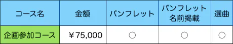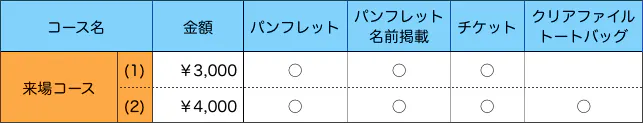 演奏会にご来場いただける方を対象としたリターンコースです。演奏会チケット(一般、3000円)を主なリターンとし、パンフレットへのお名前掲載、オリジナルグッズをセットにしたコースを設定しています。