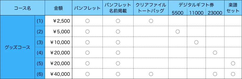グッズコースは、YMDミュージックのオリジナルグッズ(クリアファイル、トートバッグ)をセットとしたコース、楽譜販売ショップ「YMD MUSIC WEB SHOP」で使えるデジタルギフト券、演奏会で演奏する作品の楽譜セットとなっています。