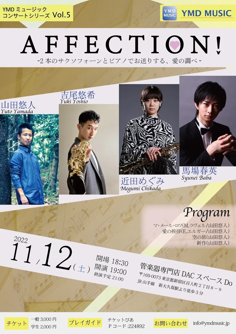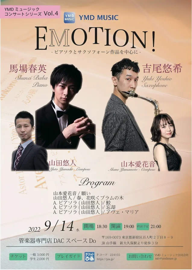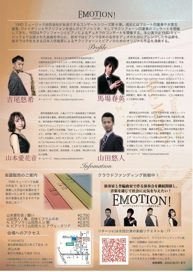 2022/08/29 18:00皆様、こんにちは!YMDミュージックでございます。本プロジェクトの募集終了まで残り2日となりました。今回ご支援を受けて開催される演奏会「EMOTION!ピアソラとサクソフォーン作品を中心に」の特徴をご紹介致します。YMDミュージックは、2020年より出版作品の演奏動画制作を行っています。コロナ禍で演奏会が十分な形で開催することが困難な中、弊社は”いつでもどこでも何度でも”お楽しみいただける演奏動画を公開し、多くの方より好評のお声を頂いております。本演奏会は、演奏会の様子を録画し、後日YouTubeにて公開する予定です。日本だけでなく世界中の方に演奏会の様子を知っていただくことを目指します。これまでに制作した演奏動画をご紹介致します。ぜひご覧ください。ルミエサクソフォンカルテットさん(ポップス・スタジオジブリ作品)Throw Lineさん(ポップス・スタジオジブリ作品)ルミエサクソフォンカルテットさん(クラシック作品)2021年8月14日開催「フルート4重奏、木管5重奏による室内楽への誘い」ライブ映像クラウドファンディングは8月31日(水)まで募集が続きます。引き続き応援・ご支援のほどよろしくお願いいたします!■EMOTION!ピアソラとサクソフォーン 作品を中心に■・公演日時9月14日(水)18時30分開場、19時開演・会場管楽器専門店ダク Musical Instruments Shop DAC スペースDo(東京都新宿区)・演奏吉尾悠希、馬場春英、山本愛花音・作編曲山田悠人、山本愛花音・演奏曲春、花咲くプラムの木(山田悠人)願い(山本愛花音)他・チケット一般3,000円、学生2,000円・プレイガイドチケットぴあ(Pコード:224155)■AFFECTION!2本のサクソフォーンとピアノでお送りする、愛の調べ■・公演日時2022年11月12日(土)18時30分開場、19時開演、21時終演予定・会場管楽器専門店ダク Musical Instruments Shop DAC スペースDo(〒169-0073 東京都新宿区百人町2丁目8−9)・演奏吉尾悠希(サクソフォーン)、近田めぐみ(サクソフォーン)、馬場春英(ピアノ)・作曲、編曲山田悠人・演奏曲空の旅(山田悠人)マ・メール・ロワ(M.ラヴェル/山田悠人)愛の挨拶(E.エルガー/山田悠人)他・チケット一般3,000円、学生2,000円・プレイガイドチケットぴあ(Pコード:224892) もっと見る