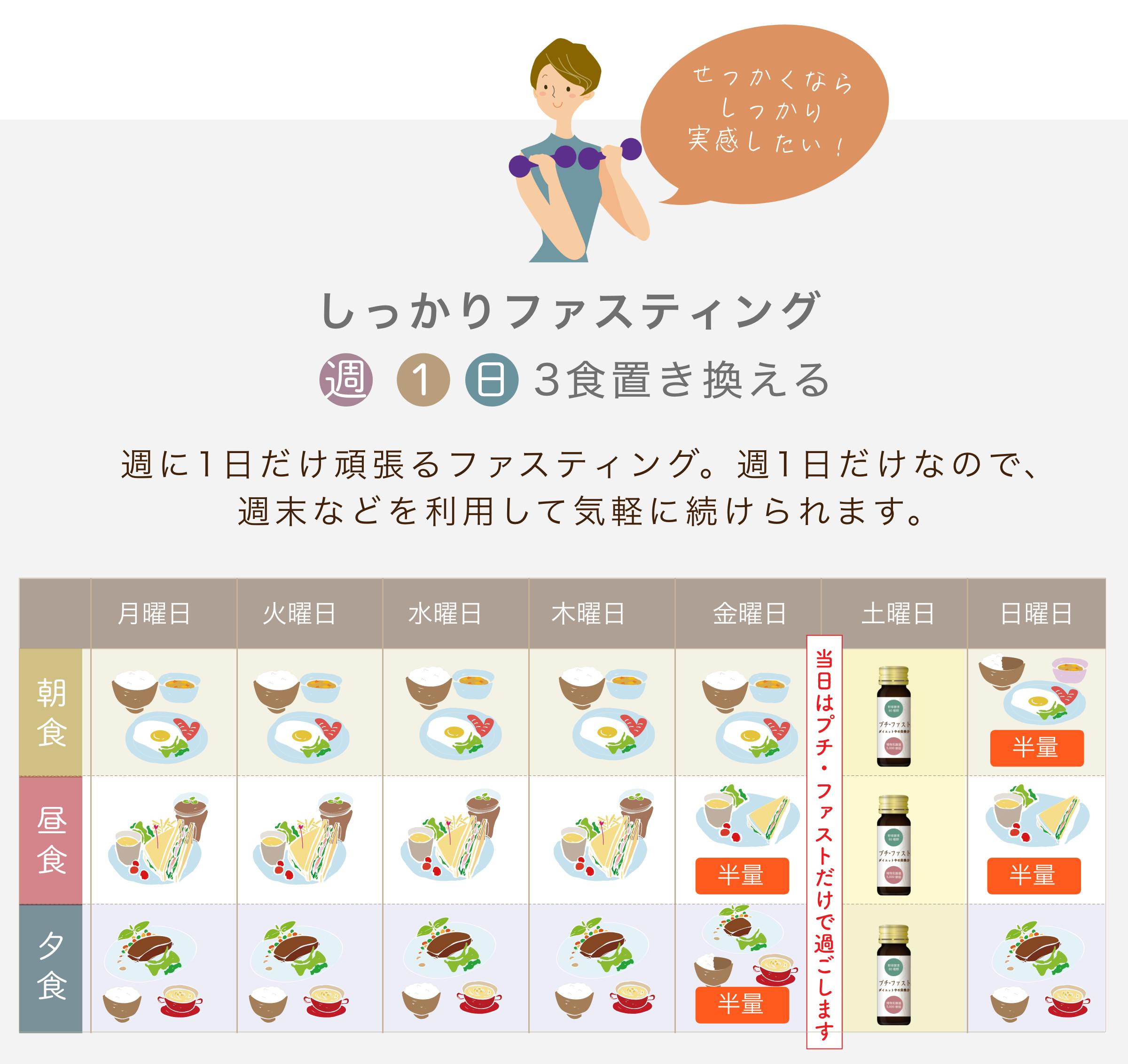 プチファストは、「ゆるっと」がモットー。週に一日ファスティングが最大で、その他1日1食だけ置き換えたり、自分のペースで無理なくファスティングできます。