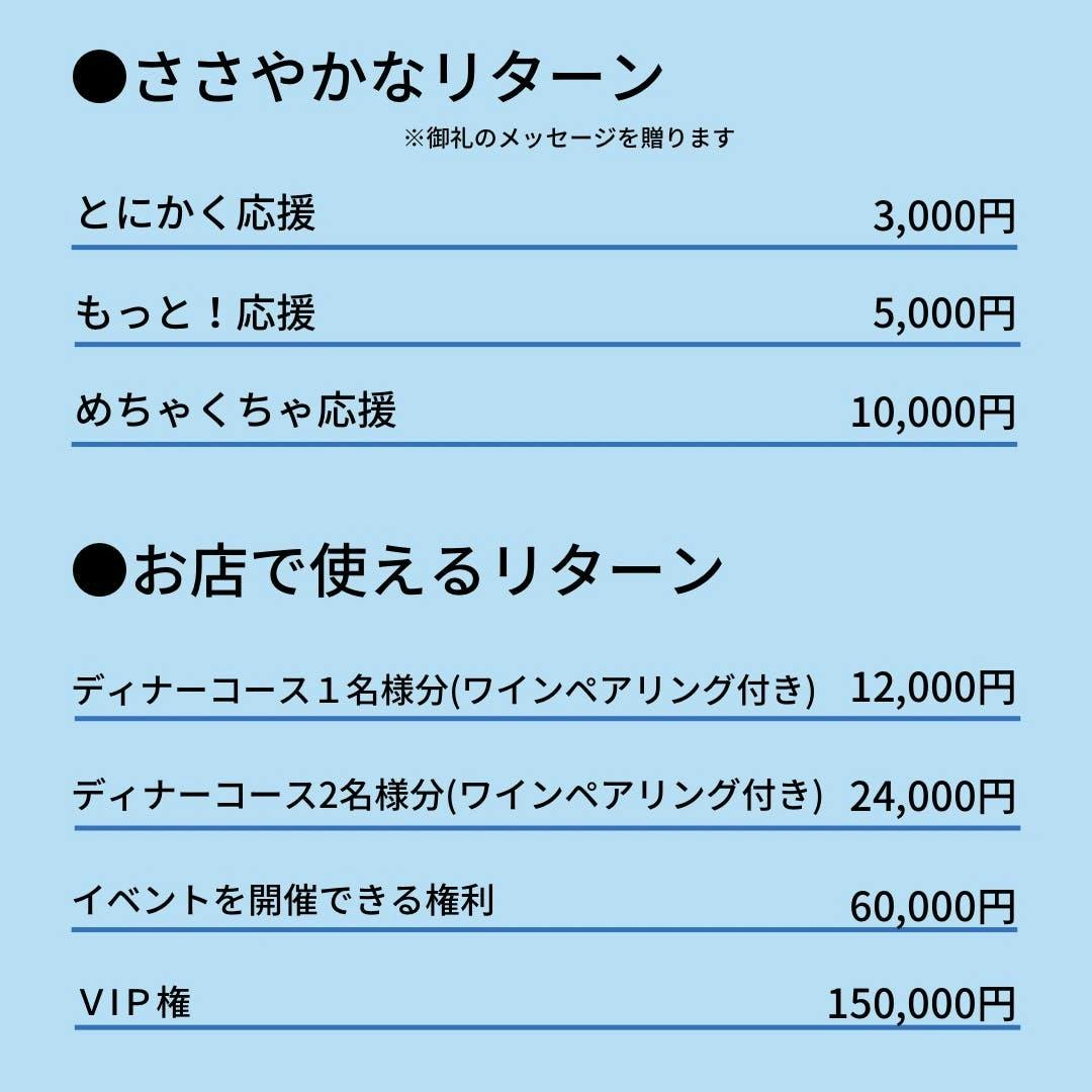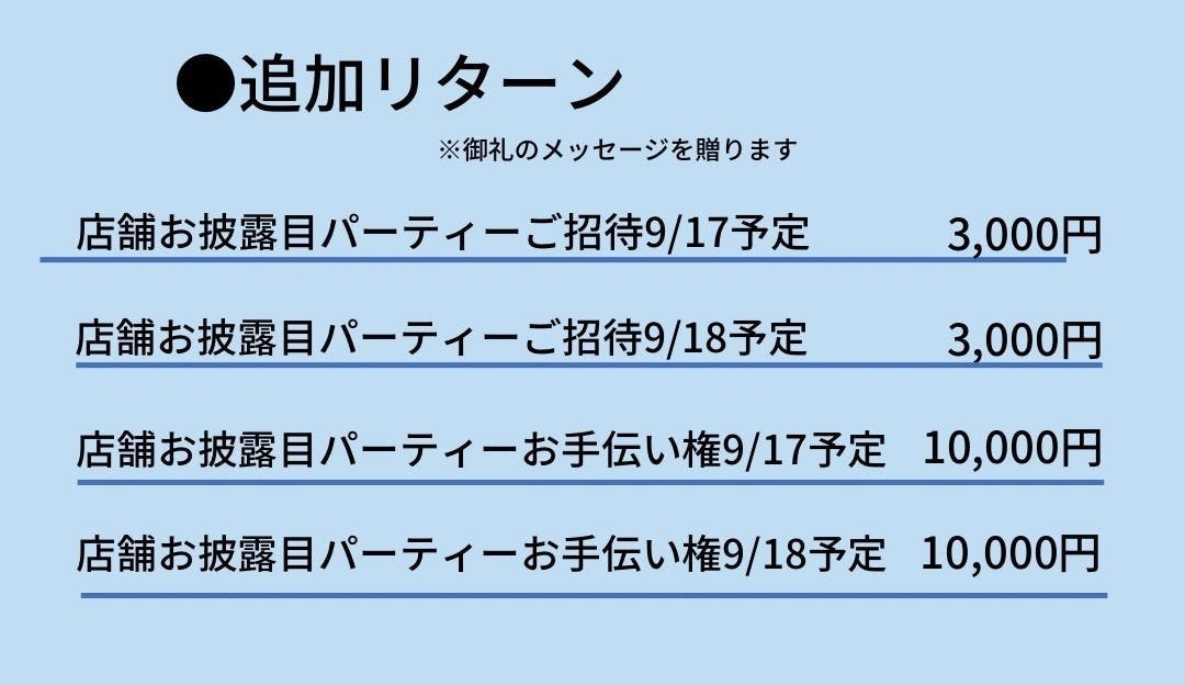 少しずつですが、店舗開業に向けての日程がでてきましたのでそれに合わせたリターンを追加でご用意致しました。