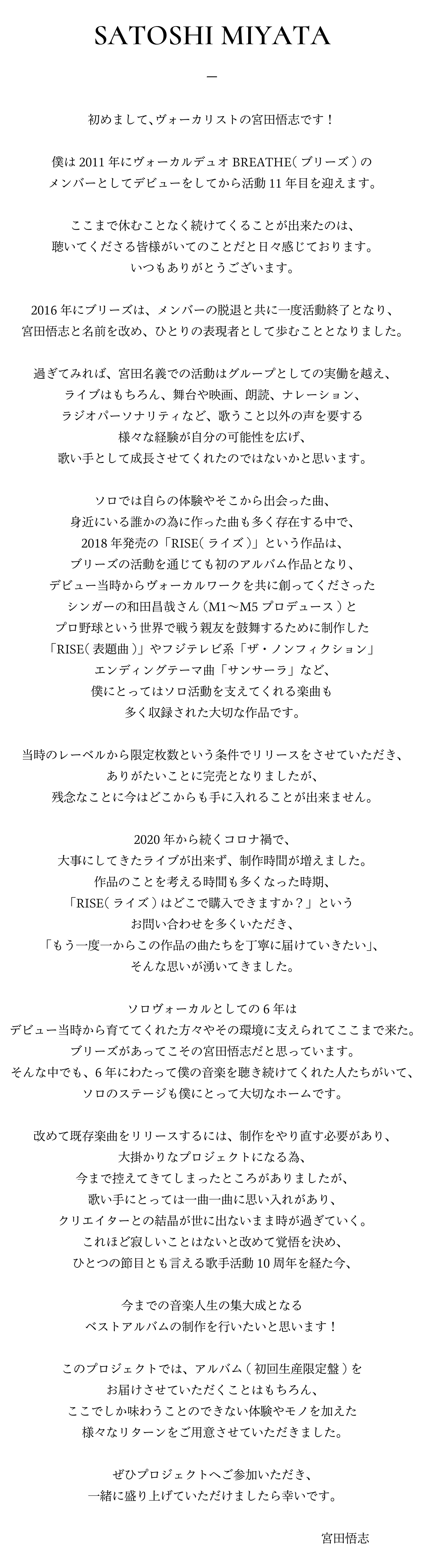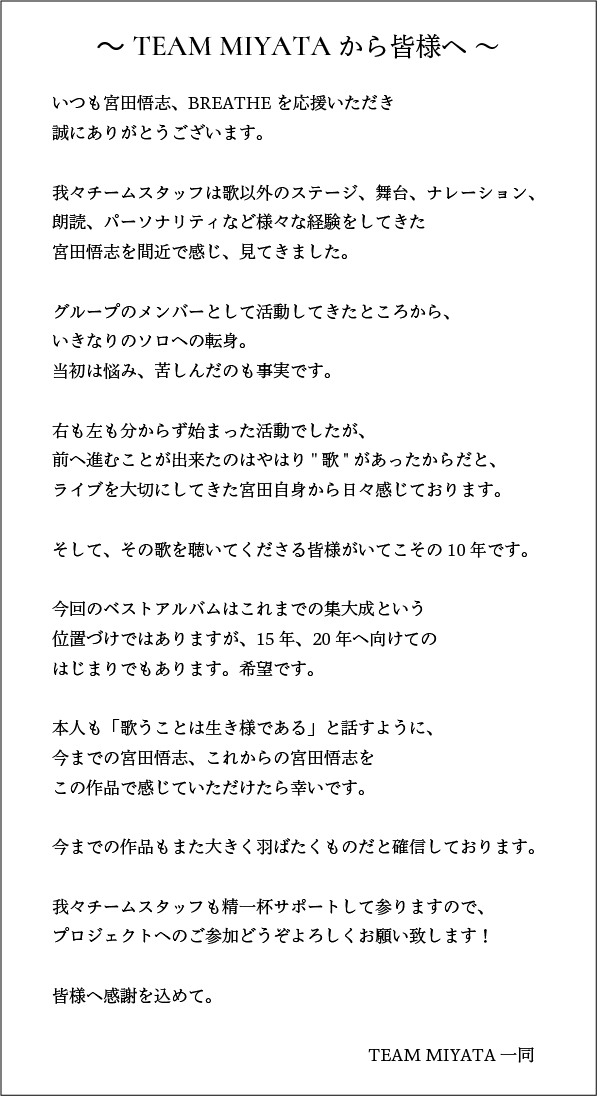 宮田悟志で6年、BREATHEで4年、計10年という音楽人生のこれまでの集大成を込めるベストアルバム。8〜10曲ずつの2枚組、計16曲〜20曲収録を目指します。