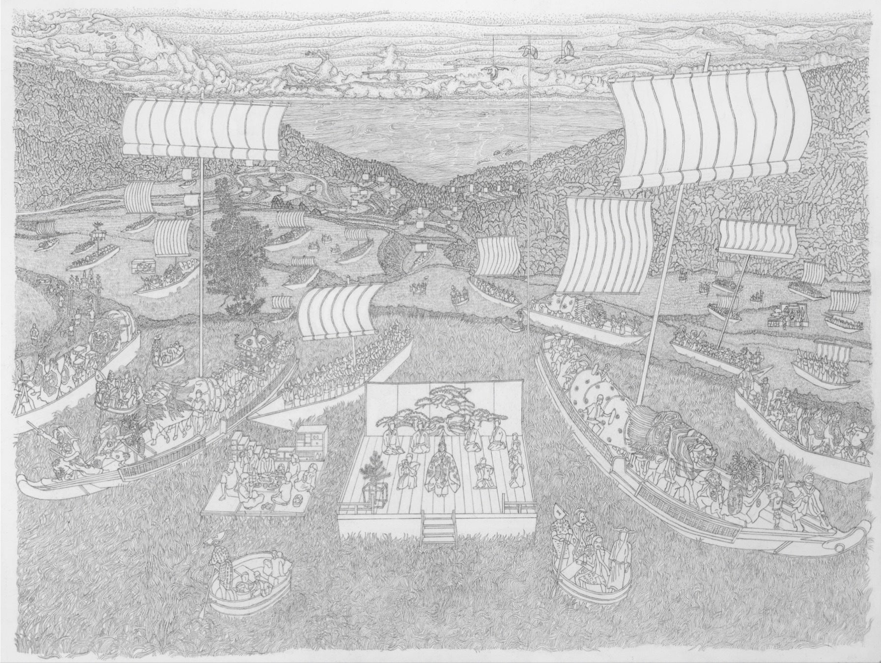能の舞台に世阿弥に扮した人物を中心にすえ、海から続く稲穂が実った金色の棚田に、伝統芸能を受け継ぐ人々が帆をあげた船に乗って上陸してくる様を表現します。 佐渡は文化が宝船に乗って運ばれてきた島だということを伝えたいのです。