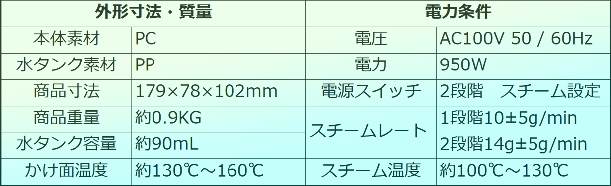 タンク容量約90mL、連続スチームは最長11分。