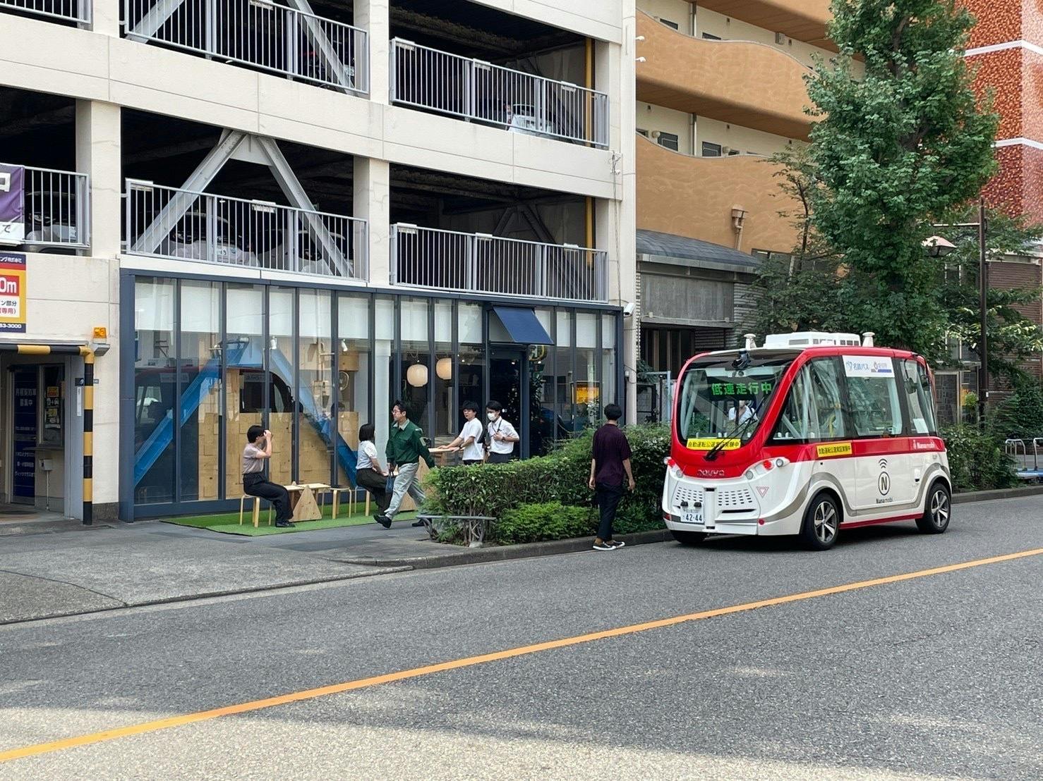 そこで、今回は、停留所の一つである「おむすび屋さん」の前の歩道に、店と連携した停留所をみなさんと作り上げたいと準備を進めています。自動運転を待つだけでなく、ちょっと座って一息ついたり、飲み物やおむすびを頬張りながら、情報や人との偶然の出会いを楽しめる場所。そんなスポットを創り上げたいと考えています。