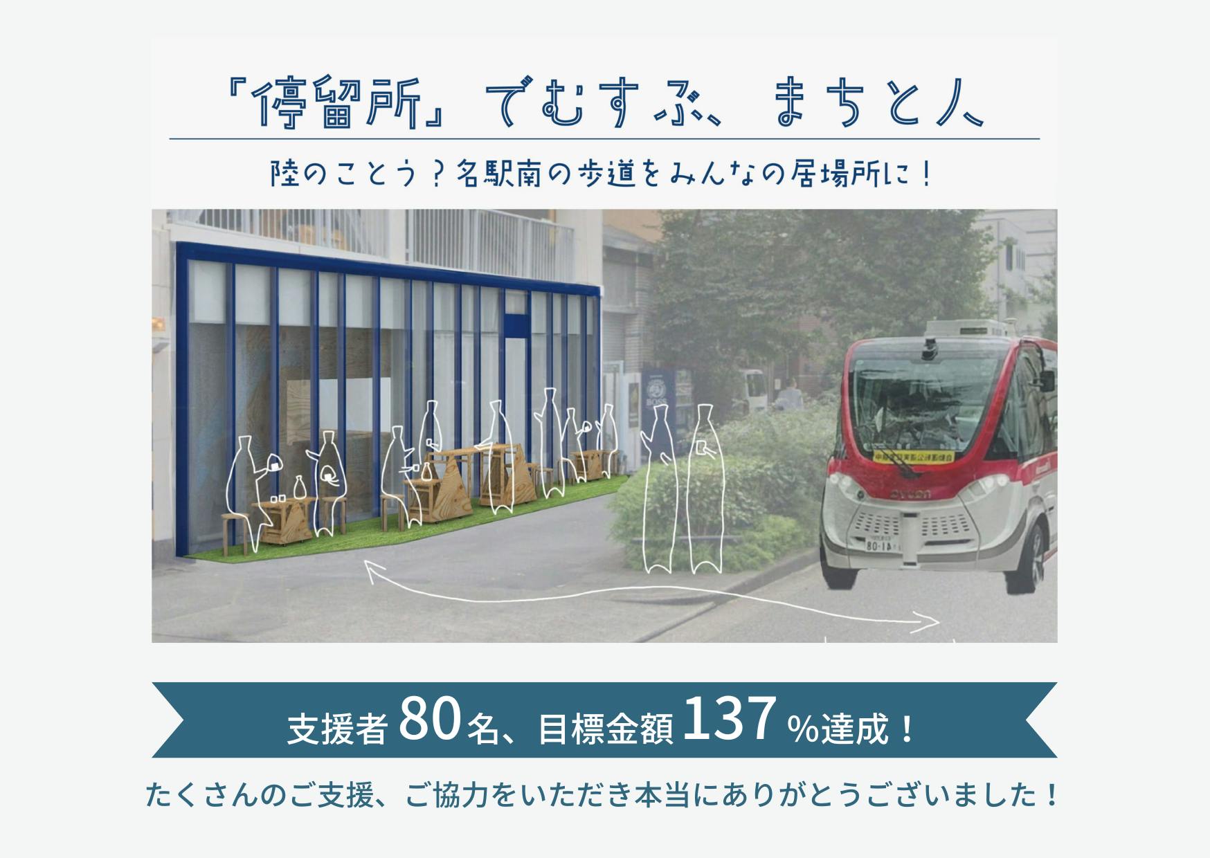 2022/09/20 16:59前回の活動報告より少し時間が開いてしまいすみません。が、まずは…【 1 0 0 % 達 成 ! ! 】のお礼とご報告を。おかげさまで、クラウドファンディング開始16日目に目標金額の400,000円を達成することができました。まずはこれまでにご支援をいただいたみなさま、そしてシェア拡散のご協力をいただいたみなさまにこの場を借りてお礼申し上げます。ありがとうございます!しかしながら、今回の取り組みをはじめ今後の名駅南での取り組みのアーカイブ、持続的な情報発信をできるようなウェブサイト作成などのスタート資金のためにも、あと10万ほどご支援を…というのが本音のところです。クラウドファンディング実施期間、残り10日となりましたが引き続きのご支援、ご協力たまわれますと幸いです。さて、少し開いてしまったこの間の「ころりんステーション」の様子のご報告です。1つ目はこちら!▶ステーションにお名前掲載しましたご支援いただいたみなさまに、ご支援時に頂戴したお名前やニックネームをころりんステーションのおむすび型の什器に掲載させていただきました。こちらは9月8日までにご支援をいただいた方の分になりますが、それ以降も随時アップデートしてまいりますので、お近くへお越しの際は、おむすび什器の裏を少しのぞき込んでみるなど、ぜひご自身のお名前を探しにお立ち寄りいただけたらうれしいです。そして、2つ目。▶実証実験進行中「ころりんステーション」には、日々、愛知県の自動運転実証実験に参加の方々も多くお立ち寄りいただいております。その中で、実は私たち伊藤孝紀研究室もいくつかの実験を一緒にさせていただいています。1つが、「自動運転が知的生産性に どのような影響を与えるか」。こちらについては、名古屋工業大学内の他研究室も含めた学生のみなさんや、自動運転の実証実験にも連携をされているSTATION Ai株式会社のみなさまにもご協力いただき進めています。その際、多くの方に実験参加前のひと休憩や、おむすび屋さんのおむすびやレモネード、スムージを楽しみながらの時間に「ころりんステーション」をご活用いただき、思わず写真におさめたくなる風景が日々生まれています。そして、もう一つが9月23日に行われる「未来の車を体験!自動運転ワークショップ」です。※9月19日にも開催を予定しておりましたが、台風14号の影響に伴い、ご参加いただくみなさまの安全性確保のため、残念ではありますが中止とさせていただきました。ご了承くださいませ。今回のワークショップは、「運転しなくてもいい車に乗ることが普通になったら、私たちにとっての移動はどう変わるのだろう?」というテーマで、参加してくださるみなさんと自動運転の試乗を通じて仕組みや事例を学びながら、子供たちに自動運転によるくらしや社会の変化について考えてもらう、という内容です。詳細は、こちらもぜひご覧ください。Willer株式会社自動運転バスNanamobiウェブサイトやむを得ず19日の回は中止となってしまいましたが、23日には多くのみなさんにこの機会を楽しんでいただけるよう改めて準備を進めてまいります!ご参加いただけるみなさまにお会いできるのをスタッフ一同楽しみにしております。★ころりんステーション設置場所: クリばこ前 【クラファン進捗状況】現在クラファン開始20日目。これまでに59名の方々にご支援いただき、目標の105%まで来ました!すでにご支援をいただいたみなさまありがとうございます。残り10日間、引き続き楽しみつつ、その輪を一緒に、もう一息、広げていただけたらうれしいです。 もっと見る