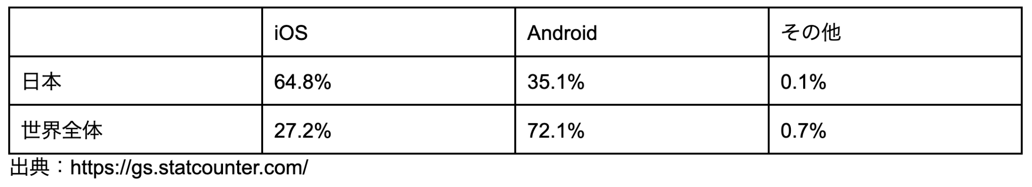 OSシェアを見てみると、日本ではiOSが多いのに比べて、世界的に多いのはAndroidなんです。