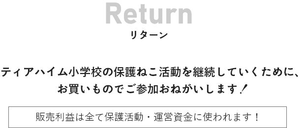 ティアハイム小学校は、寄付やボランティアなど、一部の人々の多大な負担に依存しがちだった保護活動から一歩進み、全国の猫を愛する皆さんにお買い物を通して保護猫活動に参加してもらい、「みんなで猫を助ける」運営を目指しています。