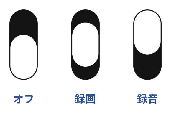 本体の右側のスライドスイッチで簡単にOFF/録音/録画を切り替えることができます。スイッチを録音/録画モードにスライドすると、「X2」は裏側にある青ランプ/赤ランプが3回点滅した後、自動的に録音/録画を開始します。スイッチをOFFにすると、「X2」は録音/録画した内容を自動保存してシャットダウンします。