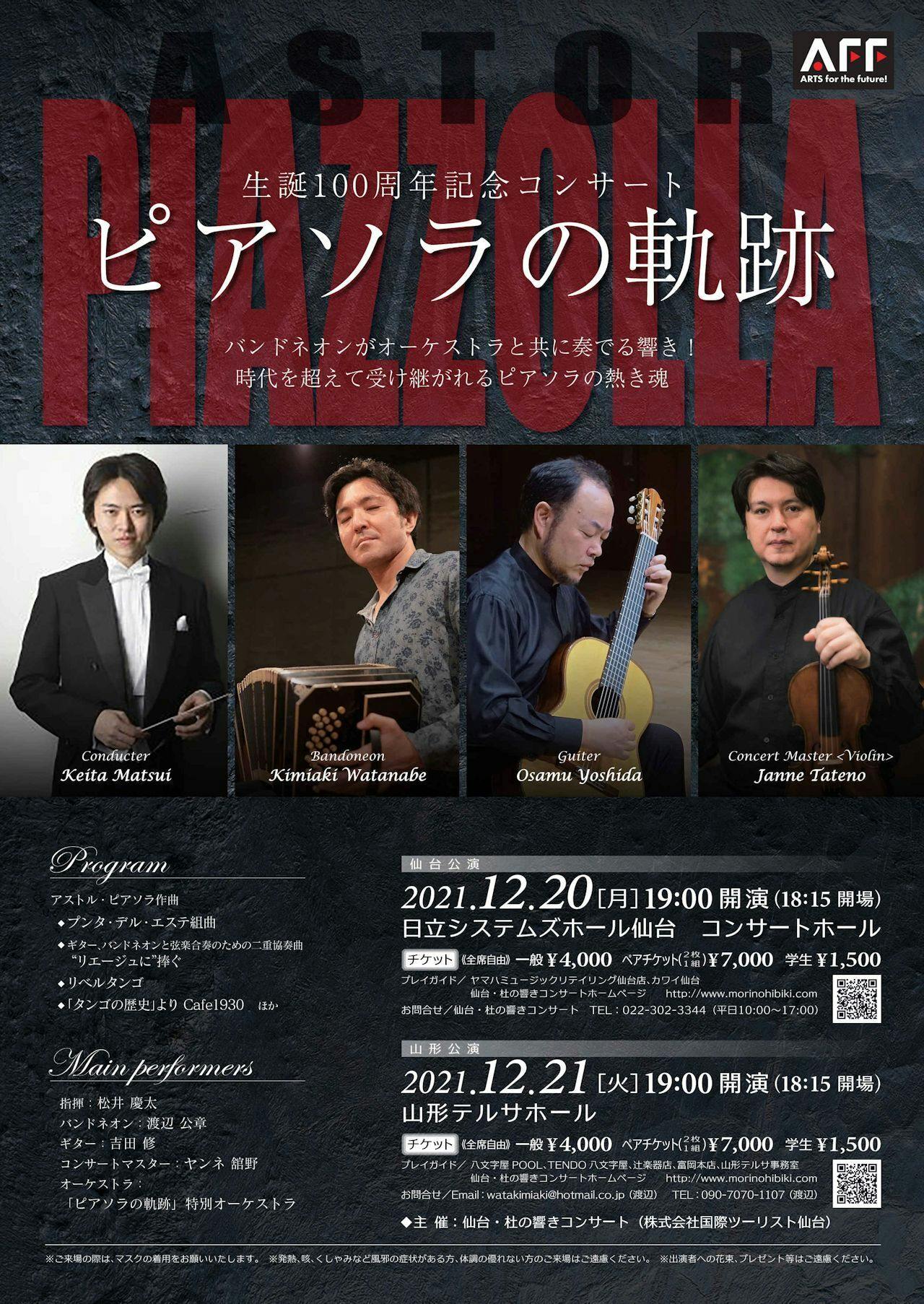 みなさん、タンゴという音楽のジャンルをご存知でしょうか?その始まりは南米アルゼンチン。抒情的で情熱的な音楽に合わせながら男女が抱き合って踊るスタイルをアルゼンチン・タンゴと呼びます。音楽としてのアルゼンチン・タンゴは、クラシック、ジャズ、ロックとも違う奥深さと味わいのある素晴らしいジャンルです。このタンゴに欠かせないのがバンドネオンという楽器です。アコーディオンのような蛇腹の楽器ですが、生産数が少なく希少で、奏者もとても少ないのです。そんな中、開催地仙台で活動している渡辺公章さんという素晴らしいバンドネオン奏者の存在を知り、地元の演奏家とコラボしながらタンゴの革命家ピアソラの作品をテーマにした演奏会を企画しました。昨年、2021年12月には今回と同じ方向性の企画でバンドネオンとオーケストラの演奏会を仙台と山形で開催しました。素晴らしい演奏会となったのですが、コロナ流行もあり、なかなか集客に結びつかず、結果多くの方に聴いてもらうことができませんでした。今回は以前のコンサートをよりバージョンアップして多くの方に聴いてもらうことを目指しています。