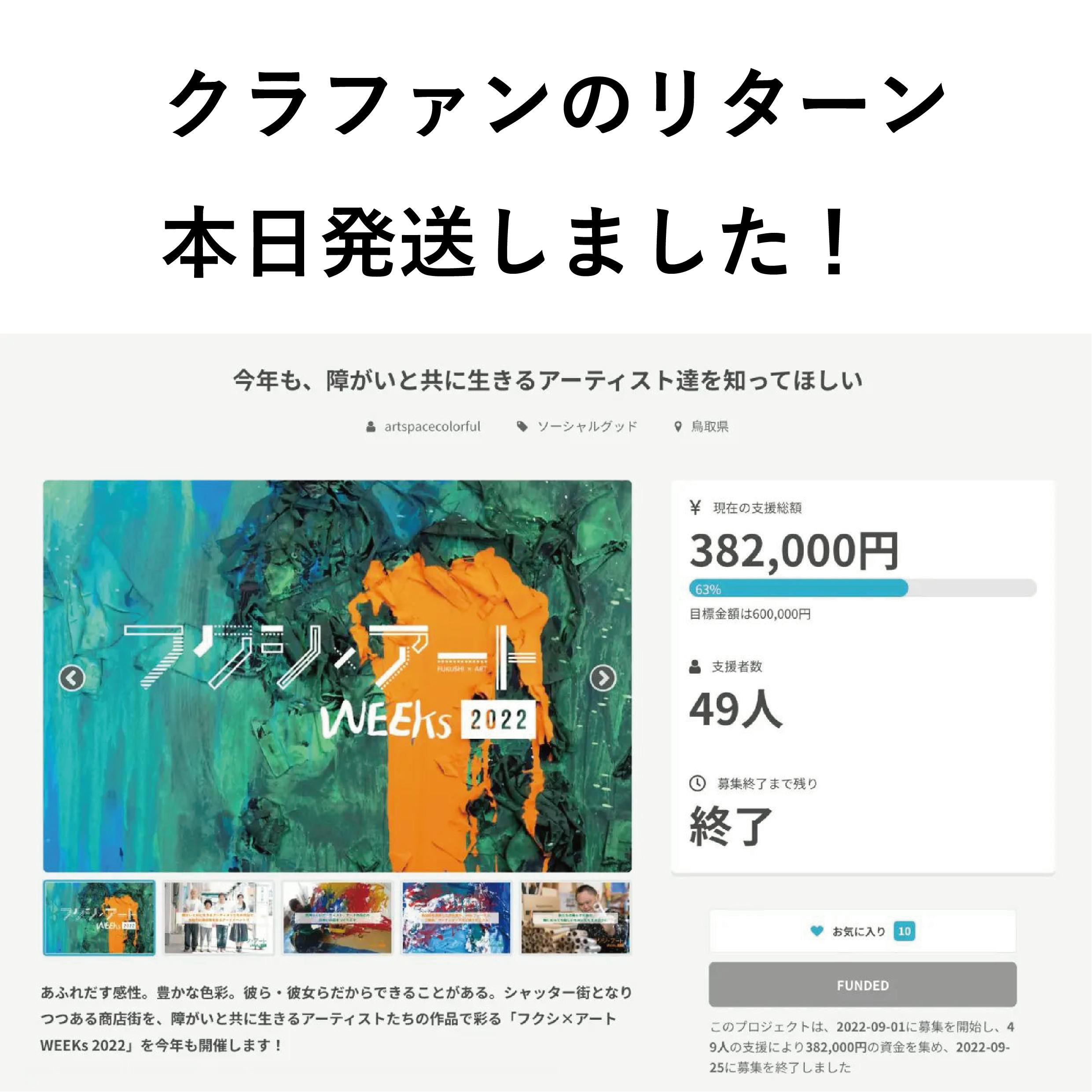 2022/12/28 18:03ご支援いただいた皆さまこの度はフクシ×アートWEEKs 2022の「今年も、障がいと共に生きるアーティスト達を知ってほしい」プロジェクトにご賛同いただき、誠にありがとうございました!!リターンの発送手続きが完了いたしました!ご支援いただいた皆さま、リターンがお手元に届くまで、今しばらくお待ちくださいませ。ご支援いただいたお金は「フクシ×アートWEEKs 2022」の開催費用のうち、今後の創作活動・発信に繋がるものに使わせていただきました。皆さまのご支援のおかげで、運営一同最後まで走り抜けることができました!重ねてお礼申し上げます。ありがとうございました!フクシ×アートWEEKs 2022は終了致しましたが、今後も障がいと共に生きる人々の表現活動がアートとして認知され、そこにある世界と可能性を多くの方々に知っていただきたけるよう、運営一同励んでまいります。:::::フクシ×アートWEEKs 2022の公式サイトはこちらからhttps://www.fukushiartweek.com/後日、イベント全体のアーカイブを公開いたします。最新の情報はこちらからInstagram https://www.instagram.com/fukushiartweek/Facebook https://www.facebook.com/fukushiartweek公式YouTubeチャンネルはこちらhttps://www.youtube.com/@week5001フクシ×アートWEEK実行委員会事務局:(一社)アートスペースからふる もっと見る