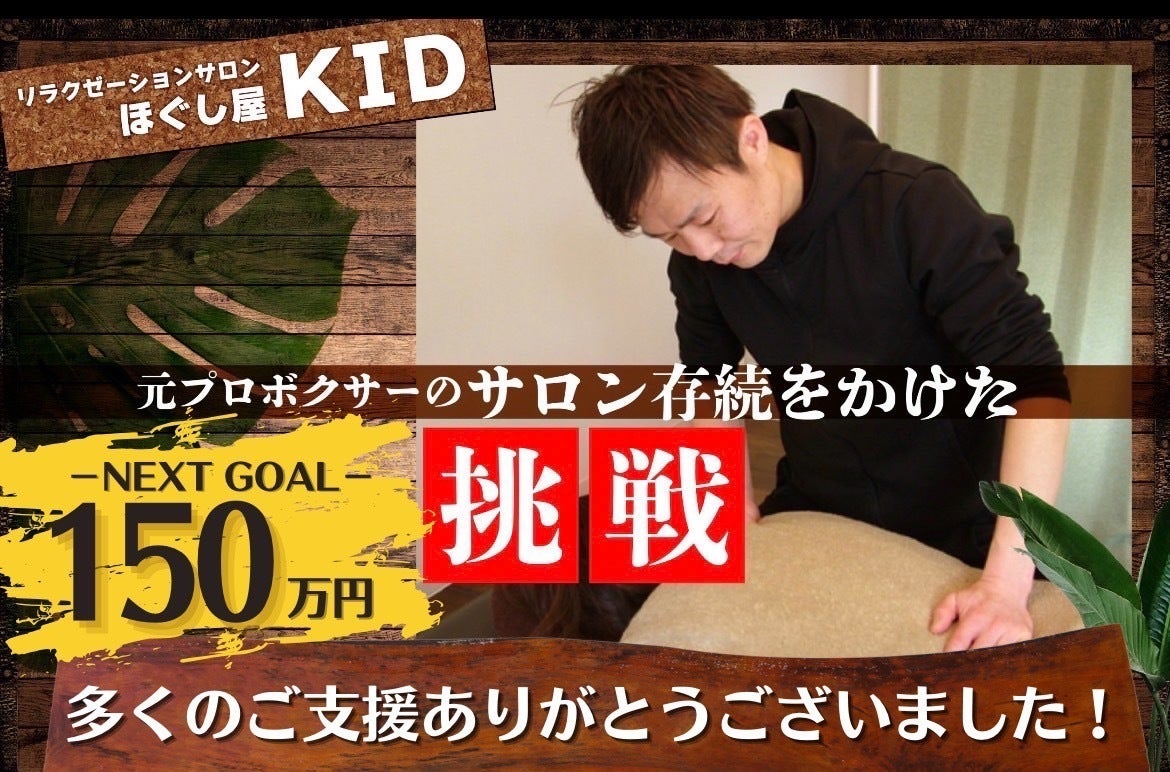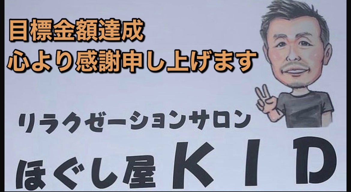 2022/09/25 09:00クラウドファンディング終了まで残り14日ほぐし屋KIDを存続させたい!整体の素晴らしさを伝えたい!この2つの想いをもってはじめさせていただいたクラウドファンディング!皆様のお力添えのおかげで目標100万円を達成することができました!ご支援、応援、メッセージをくださり本当にありがとうございます!皆様から支援していただいたお金は想いのこもった、ただのお金ではありません。大切に大切に使わせていただきます。今の自分にできる事、それは皆様の想いに応え、お店を存続させ、ご来店してくださる支援者様やお客様に最高の施術、サービスの提供をすることだと思っています。現状、支援してくださったリターンの多くは施術券を選んでくださっています。整体の素晴らしさを伝えたいと言う想いが皆様の施術を受けてみたいという形で伝わっていることが嬉しいです。ただもっと多くの方に私の施術を受けていただきたいと言う想いがあります。是非、私の施術を受けてください!また、ボクシングパーソナル券もご好評いただいております。ボクシングに興味がある方、ボクシング経験者で、さらに技量を伸ばしたい方個人のレベルに合わせた形で、ご指導させていただきますのでご安心ください。最後に自分の今までの経験を活かしたいと思い夢と希望と強い意志をもって、開業したほぐし屋KIDを必ず立て直します!引き続き応援の程、よろしくお願い致します。*私を知らない方に、自己PRしたいので自身のYouTubeチャネルのURLも貼り付けておきますので、ご興味のある方は是非ご視聴くださいませ。金光佑治とは、どんな雰囲気の人間か知ってほしいです 笑https://youtube.com/channel/UCYr9KeD_c0fAvYFVZt9ORpw長い文章を最後までお読みくださり誠にありがとうございます! もっと見る