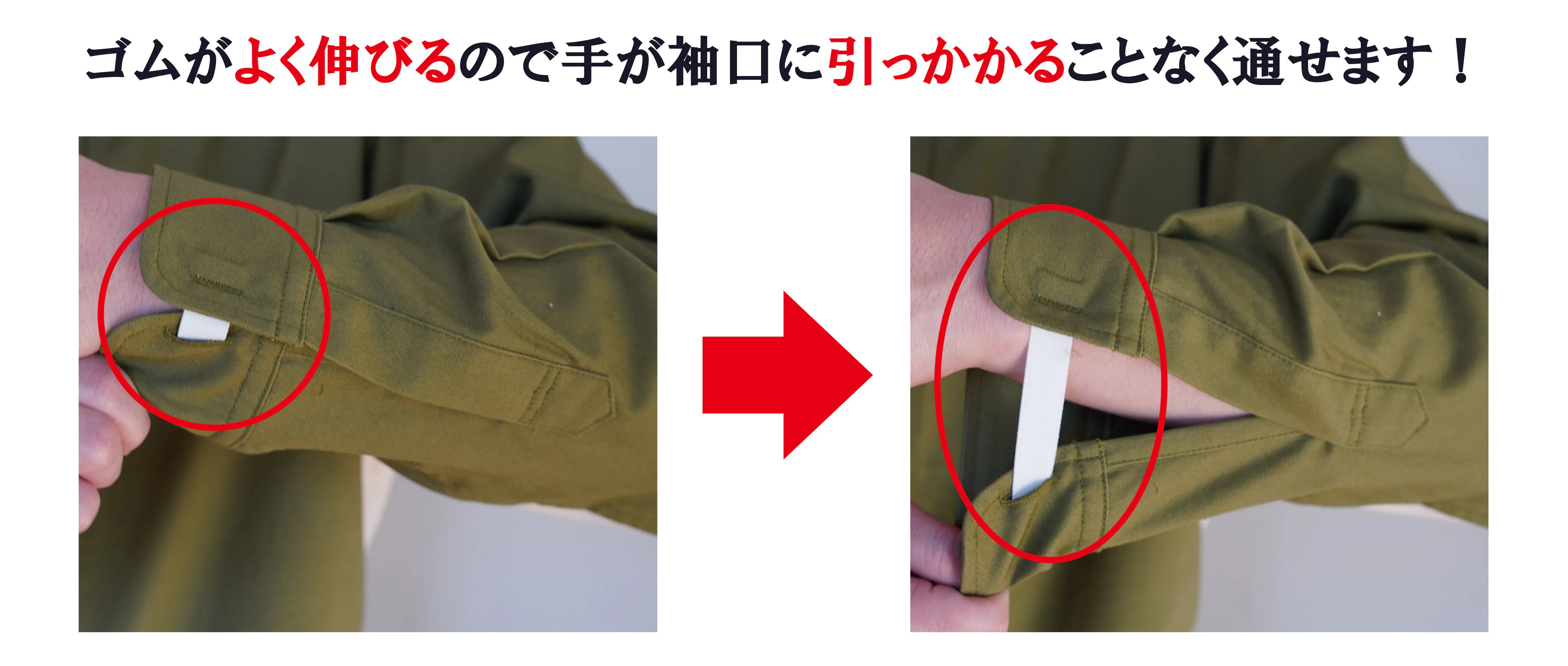 そで口のゴムは手で簡単に伸ばすことが可能です。