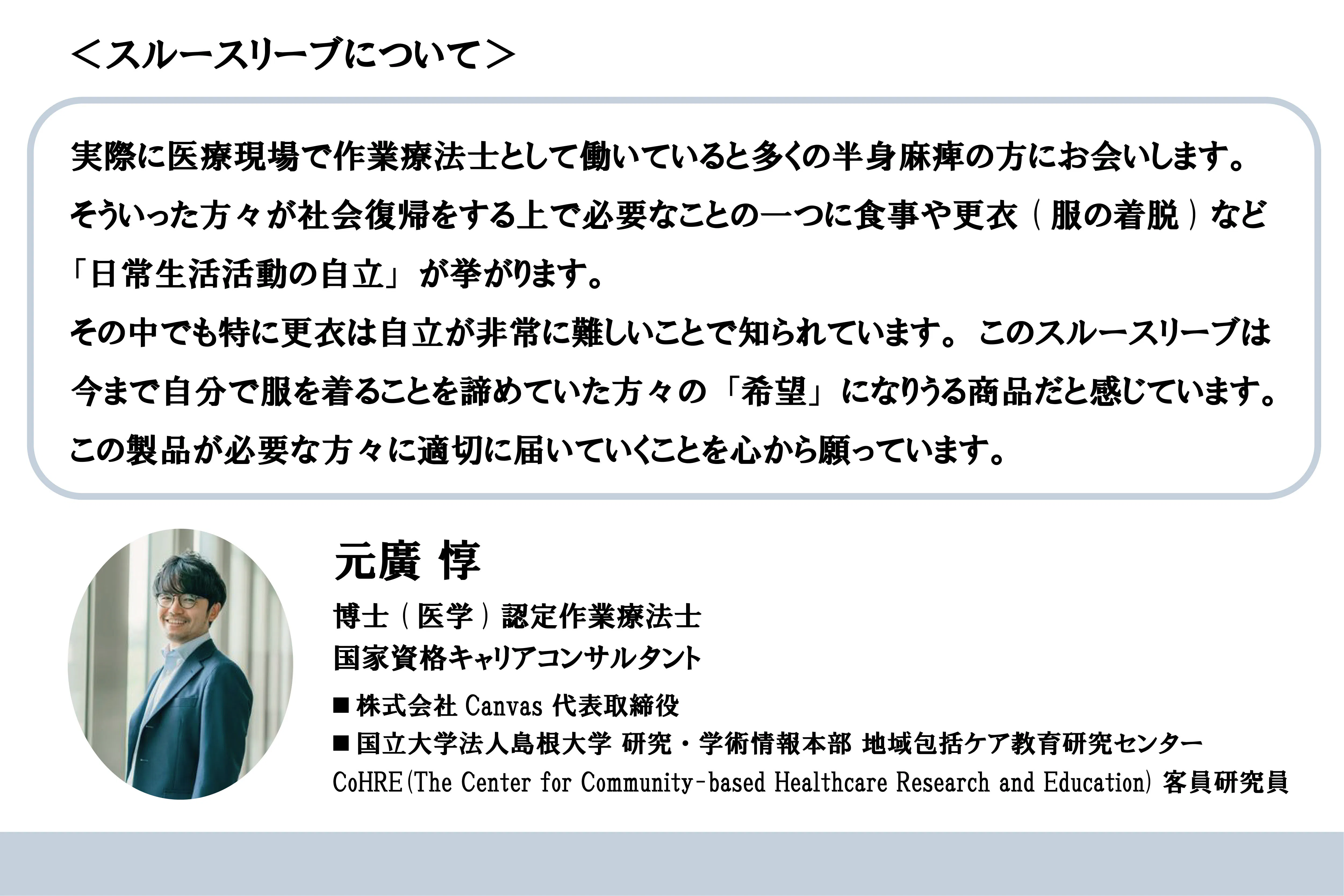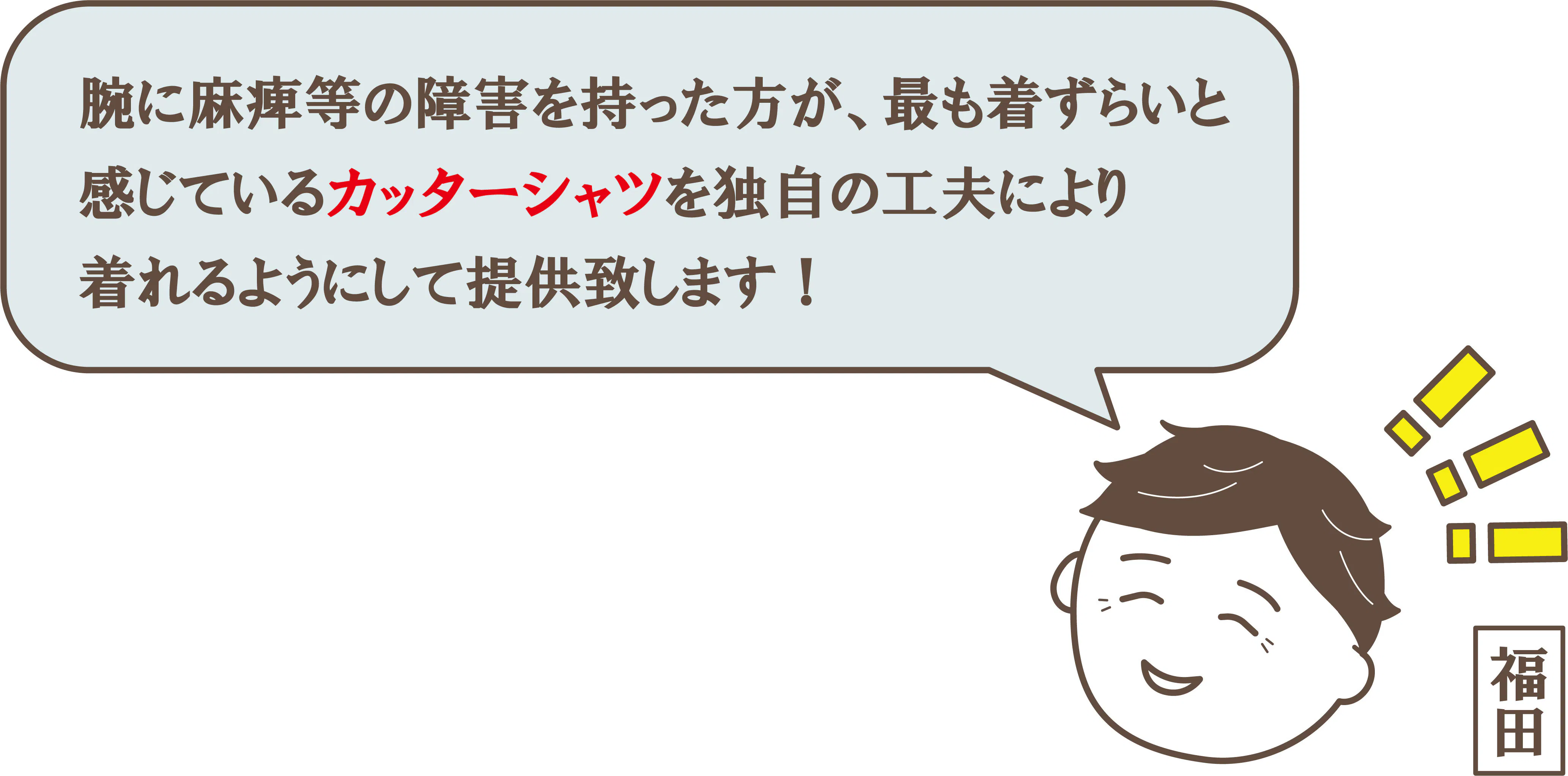 「 腕に障害を持った方が自由に服を選び簡単に着れる、そして今よりもっと気軽にファッションを楽しんでほしい。」