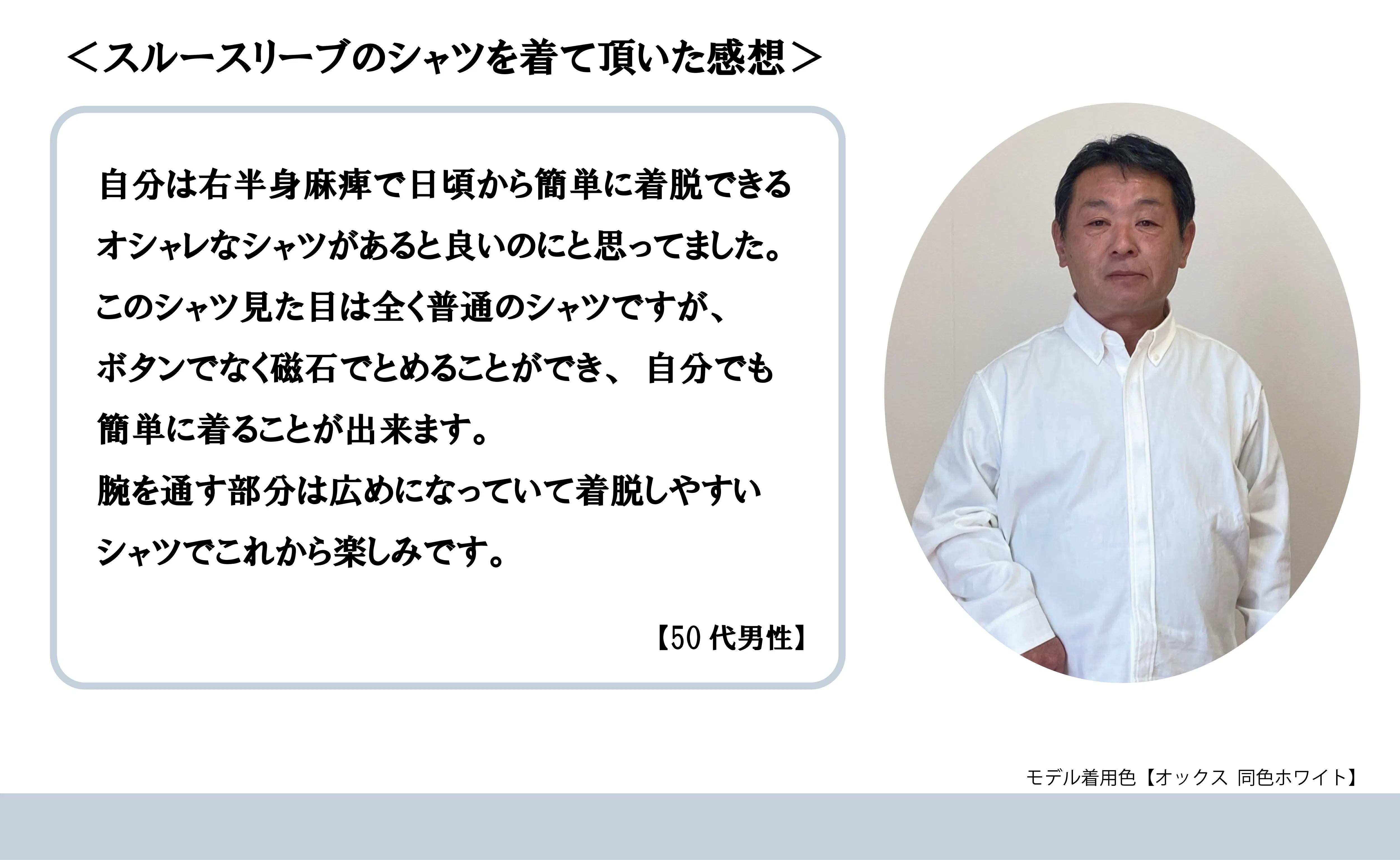 今まで麻痺でシャツを着ることが難しかった方が、簡単に着用出来ることで日々の着替えが改善します。そうすると面倒だった【着替え】に対して【楽かも】というポジティブな感情が生まれ、シャツを着ておしゃれをし楽しい気持ちを持ったまま家から外に一歩踏み出すきっかけになります。
