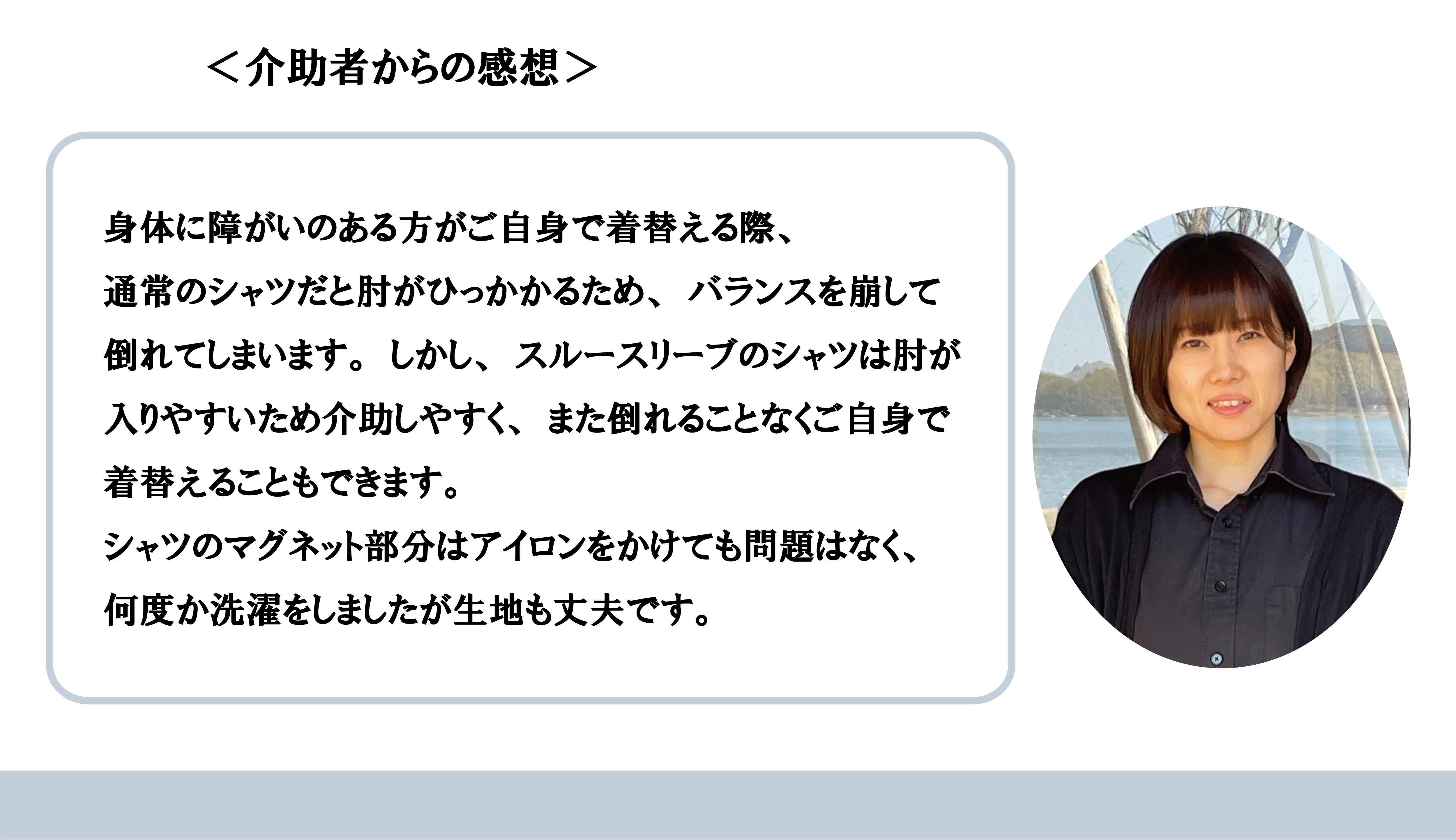 また寝たきりの方も、ほかの方が介助することでより簡単にシャツを着てファッションを楽しむことが出来た事例もあります。