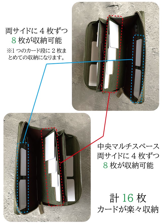 一般的な財布が膨らんでしまう原因は、解説画像の様にカードが中央に重なってしまう事が要因です。