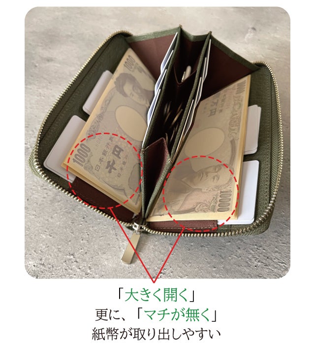 ※左側に五千円札1枚+千円札4枚、右側に一万円札5枚、計10枚収納を余裕をもって収納