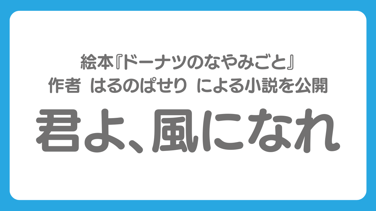 2022/11/09 17:29絵本『ドーナツのなやみごと』のクラウドファンディングにて、特注小説のコースでご支援いただき、納品していた小説を、はるのぱせりさんのHPに公開しました!タイトルは『君よ、風になれ!』です。君よ、風になれ! – KAEDE おにぎり.COMはるのぱせりさんの小説にご興味ある方は、上記のHPから、過去の小説も読むことができますので、ぜひご覧ください。 もっと見る