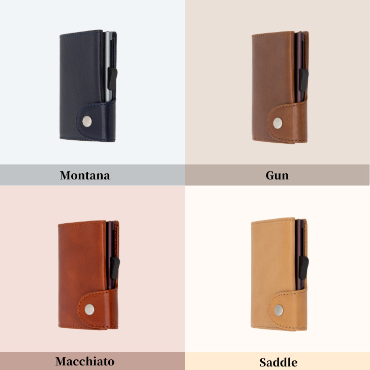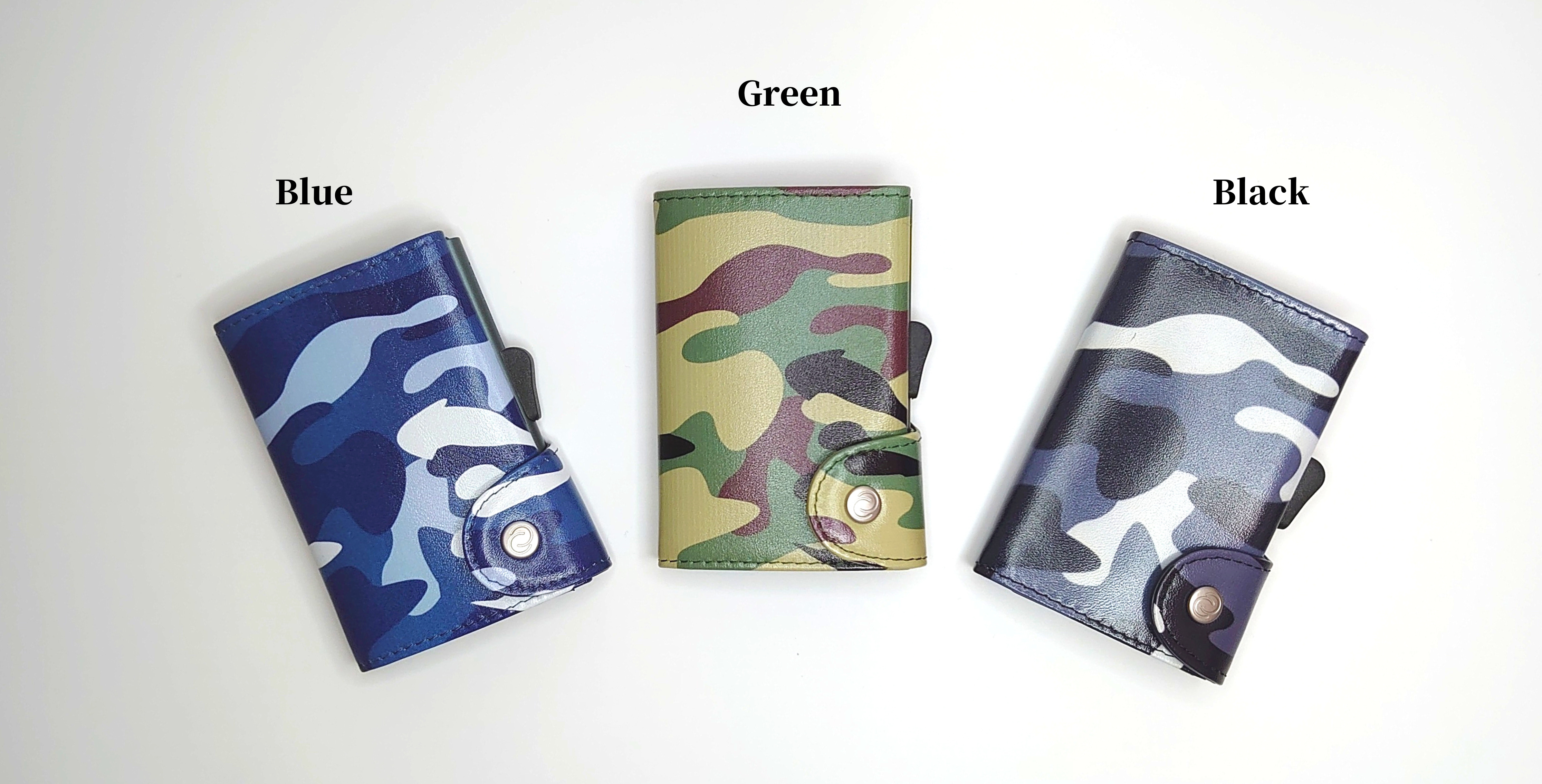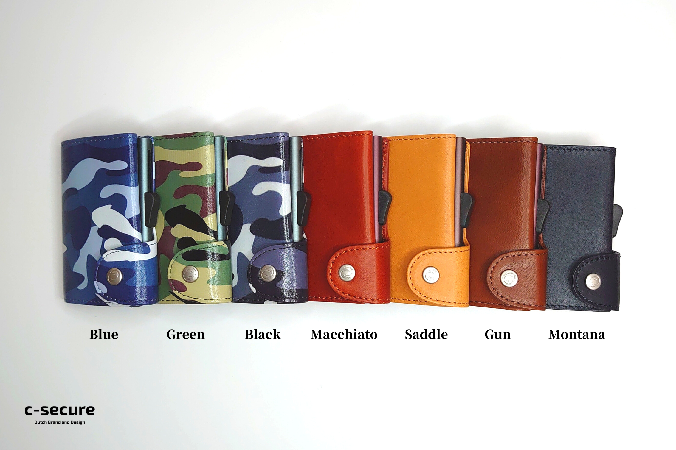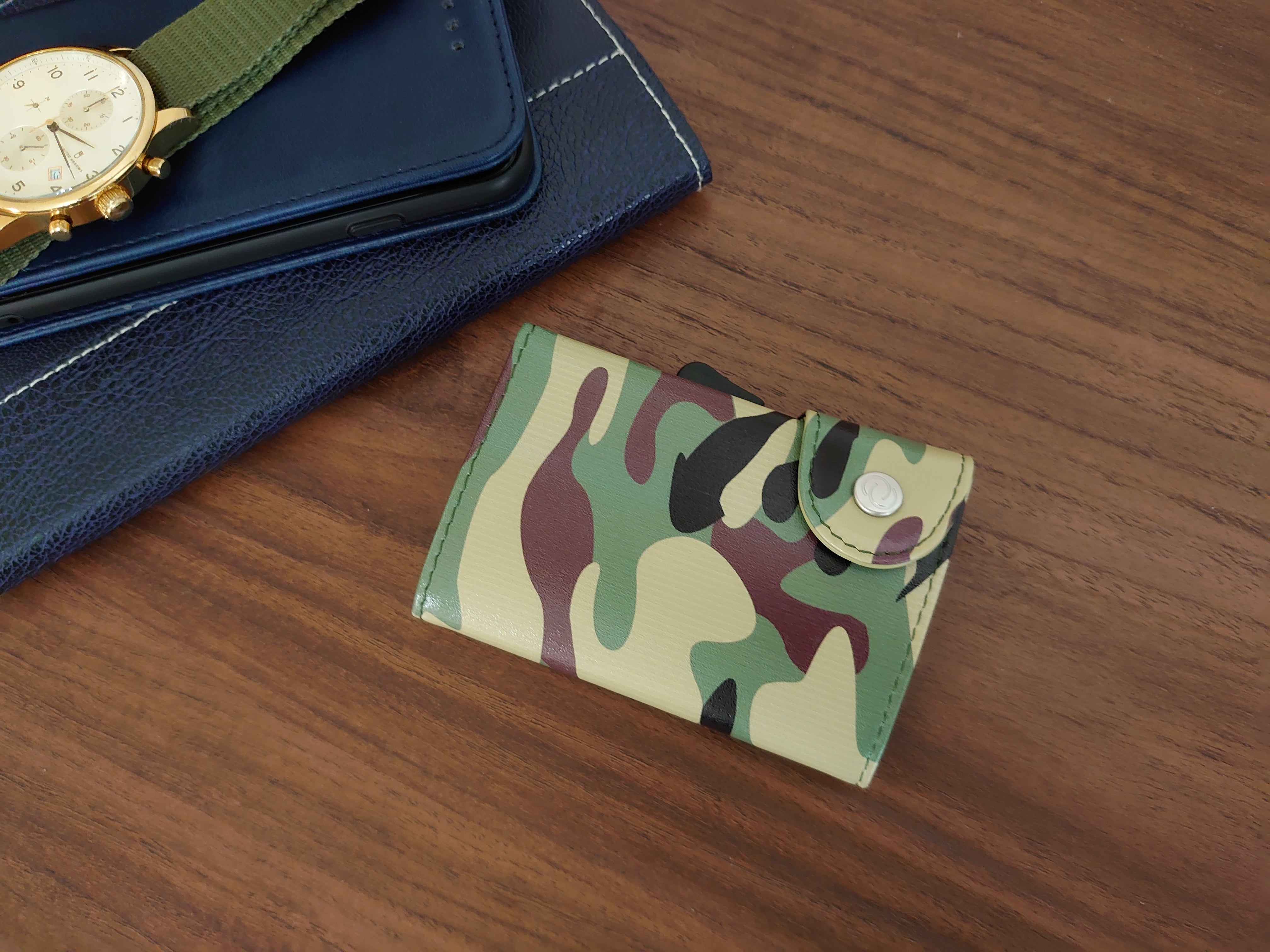 落ち着いた色合いの(C-secureシリーズではお馴染みの)一番人気のベジタブルタンニングレザー4色に加えて、クラシックオイルレザーに迷彩柄をプリントした日本未発売のオリジナルNewデザイン「カモフラスリムWallet」3色。