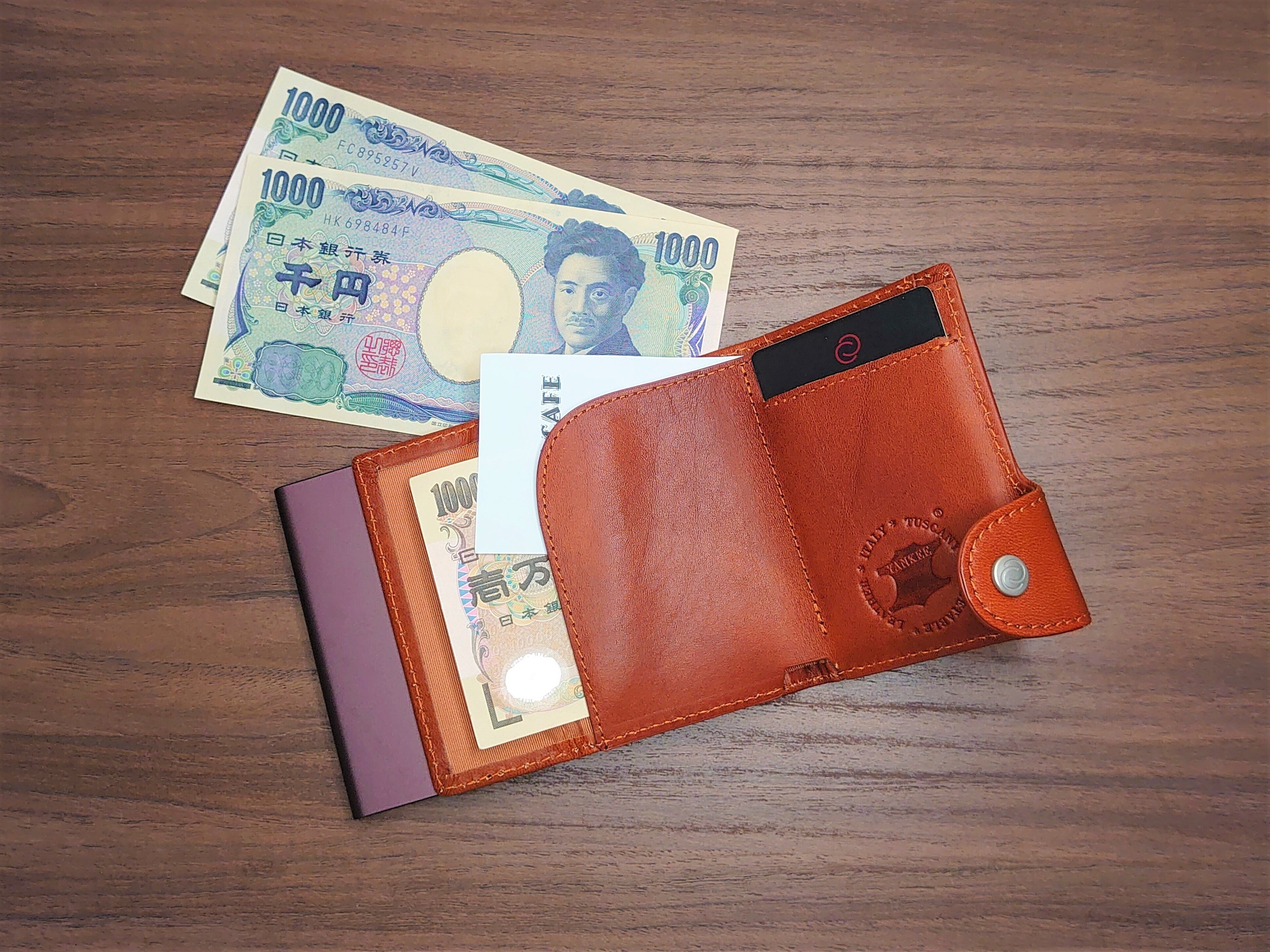 またカードケースは軽くて丈夫なアルミニウム製だから財布の重さはわずか72g。大きめの卵と同程度の重さです。厚さは15㎜です。